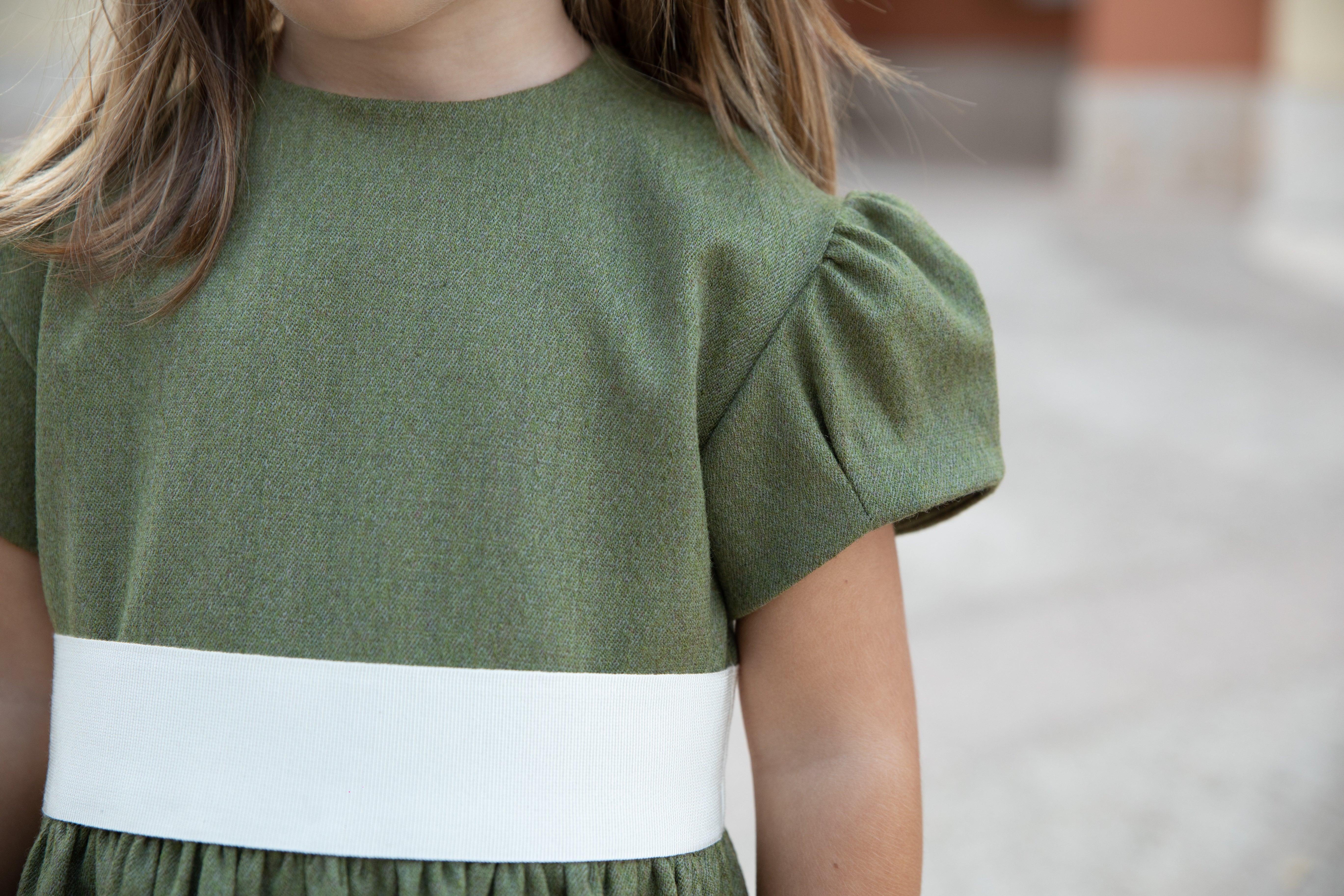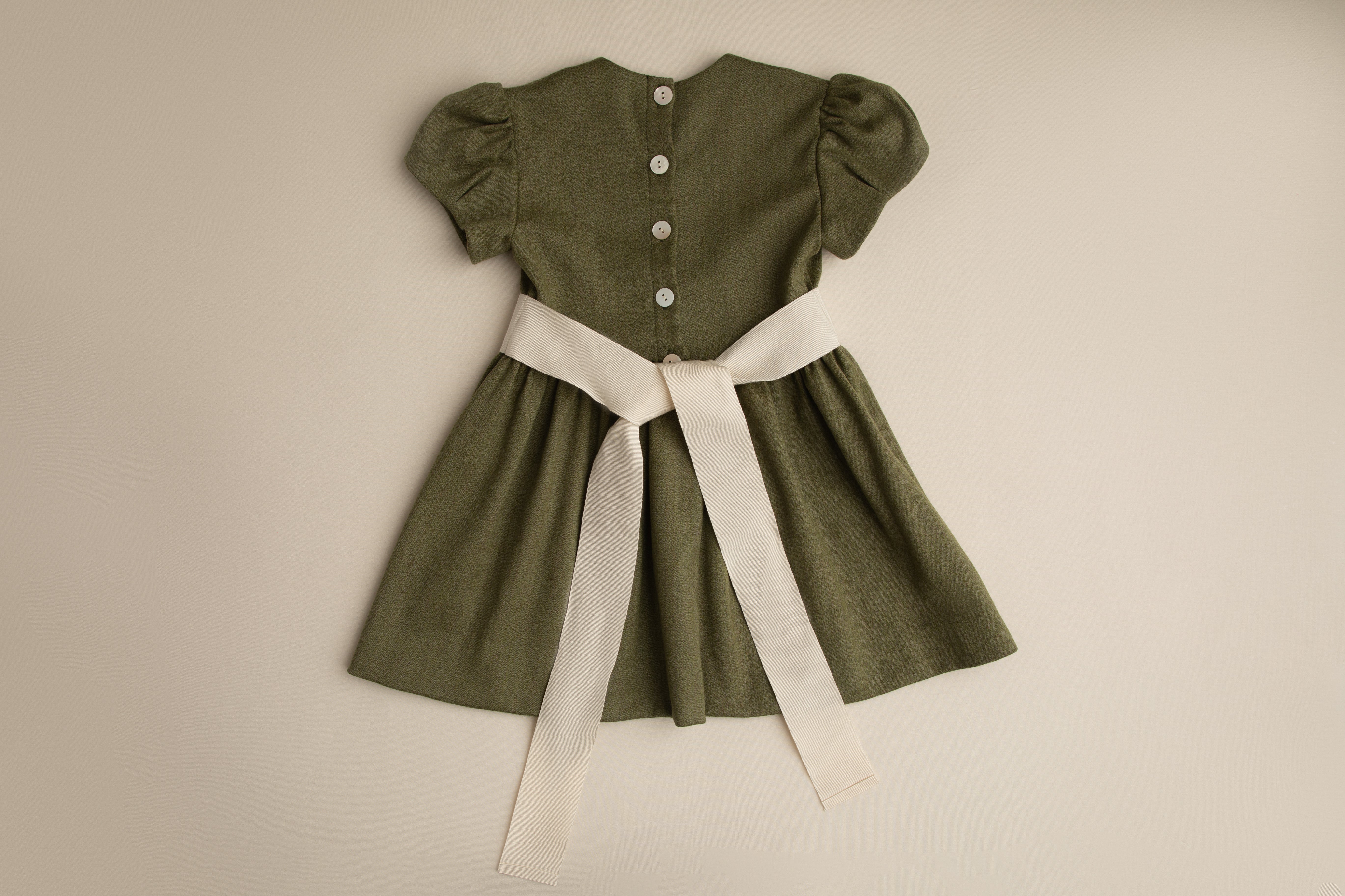 Taglio in vita con fascia e fiocco che chiude nella parte posteriore con lembi. Apertura bottoncini parte posteriore.