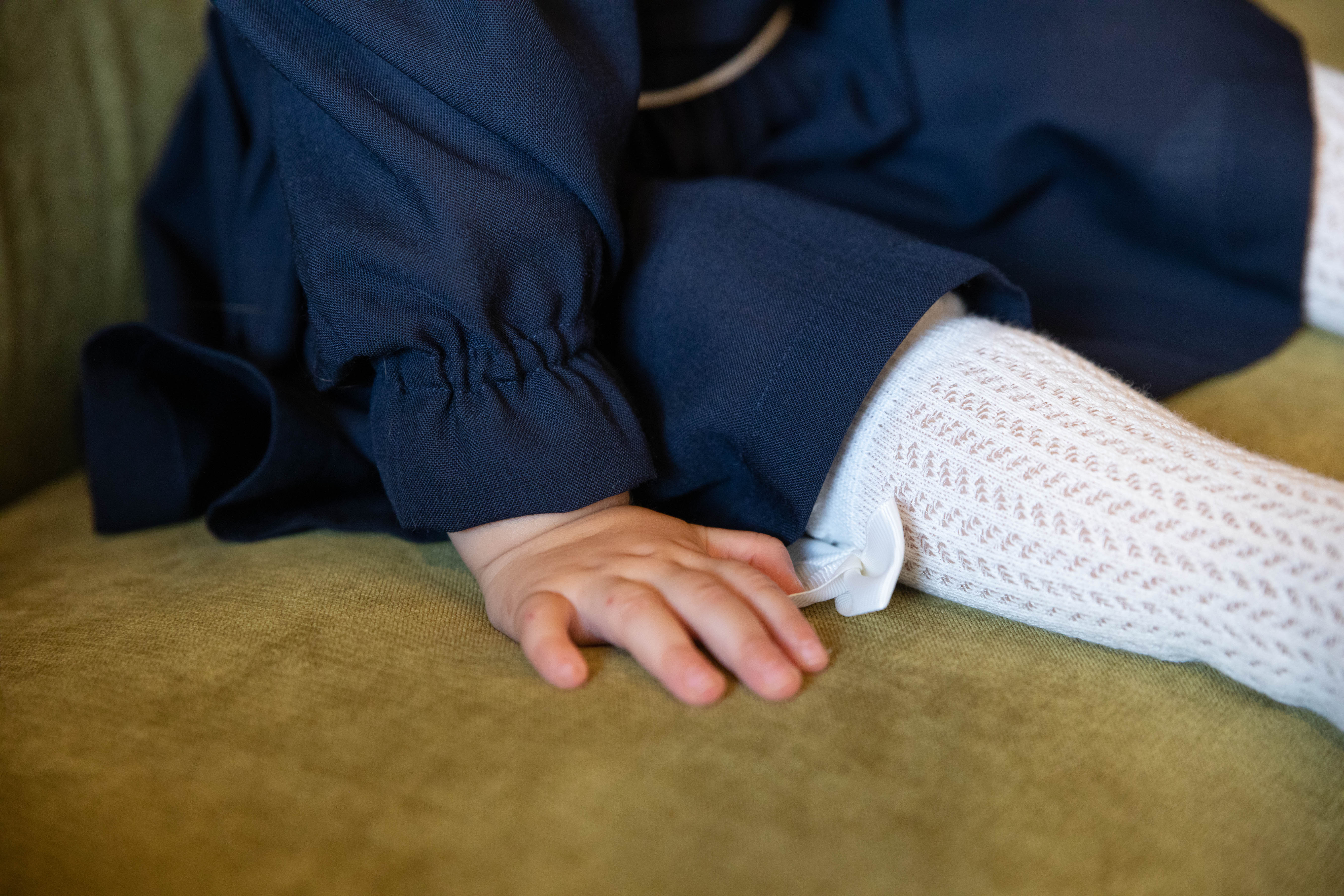 carrè profilato. Nella parte posteriore chiude con bottoncini e lembi per fiocchetto.