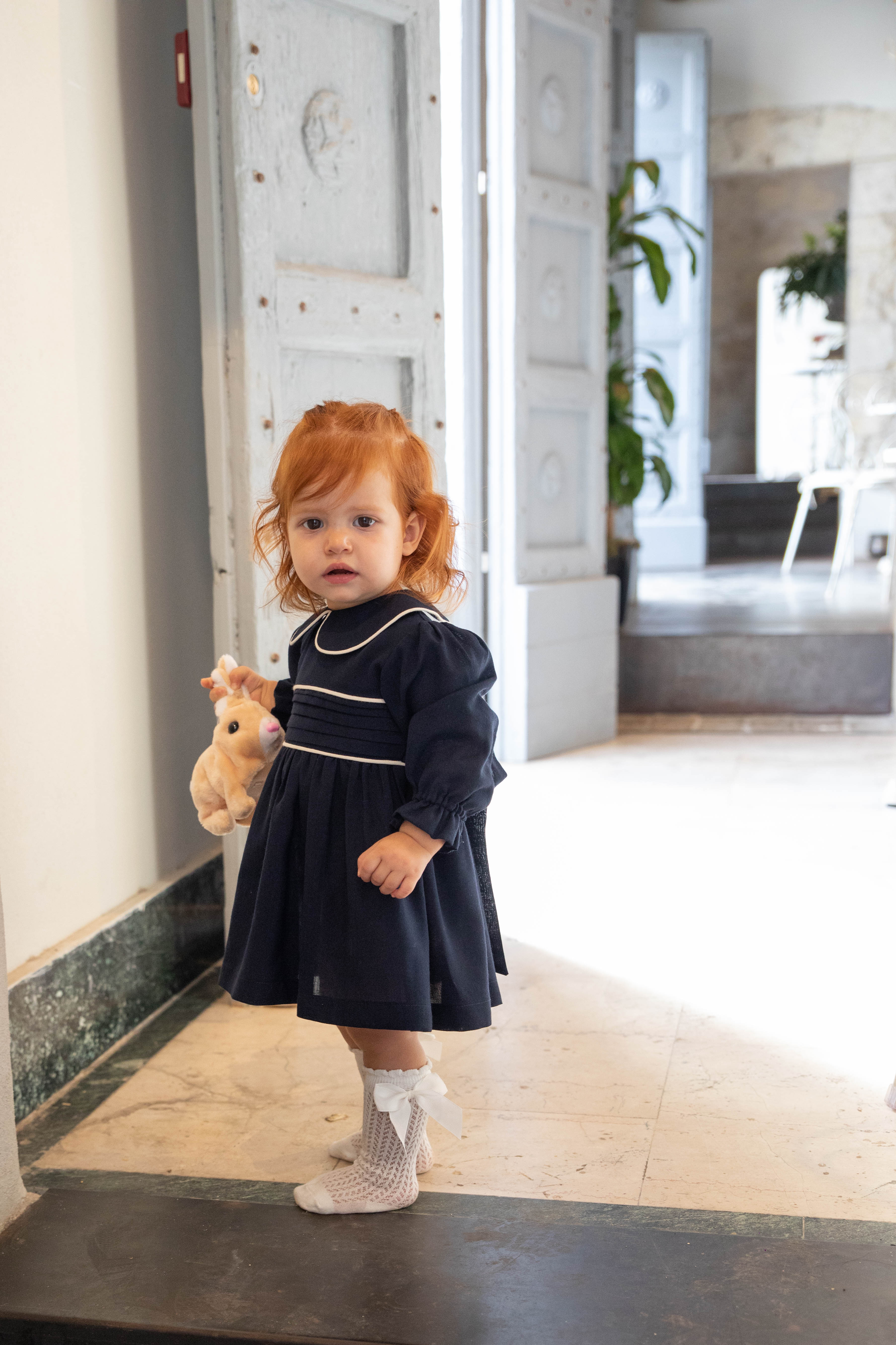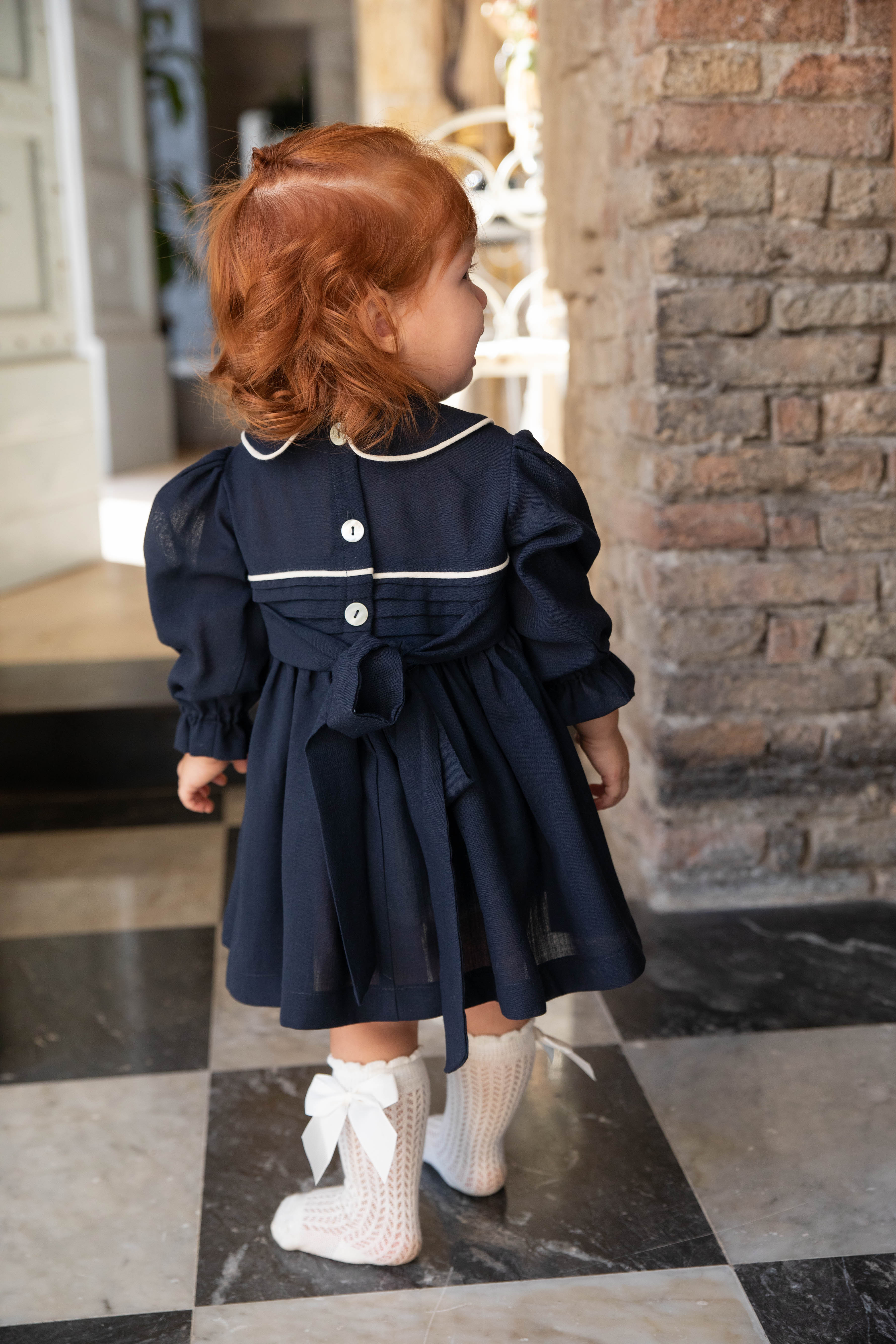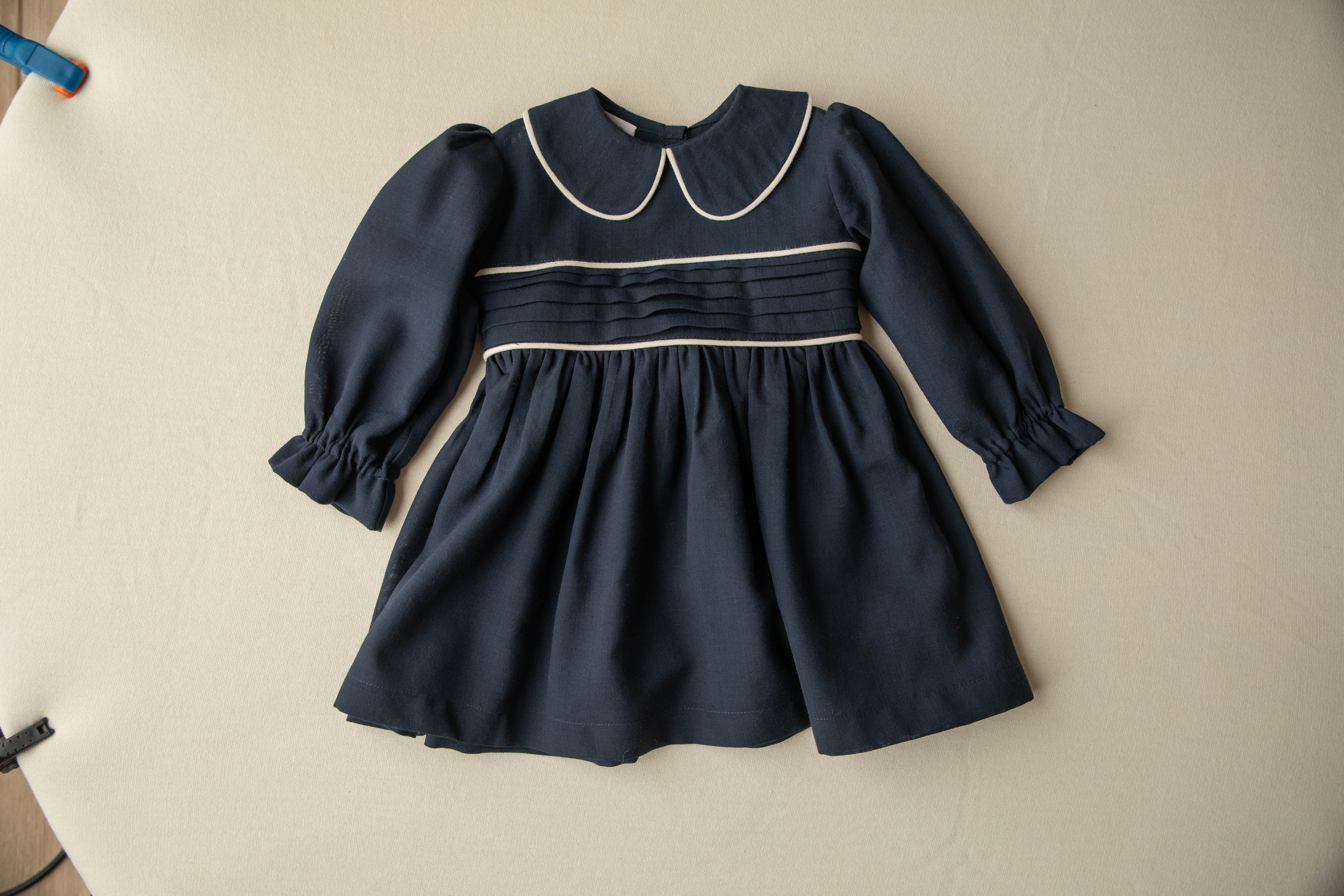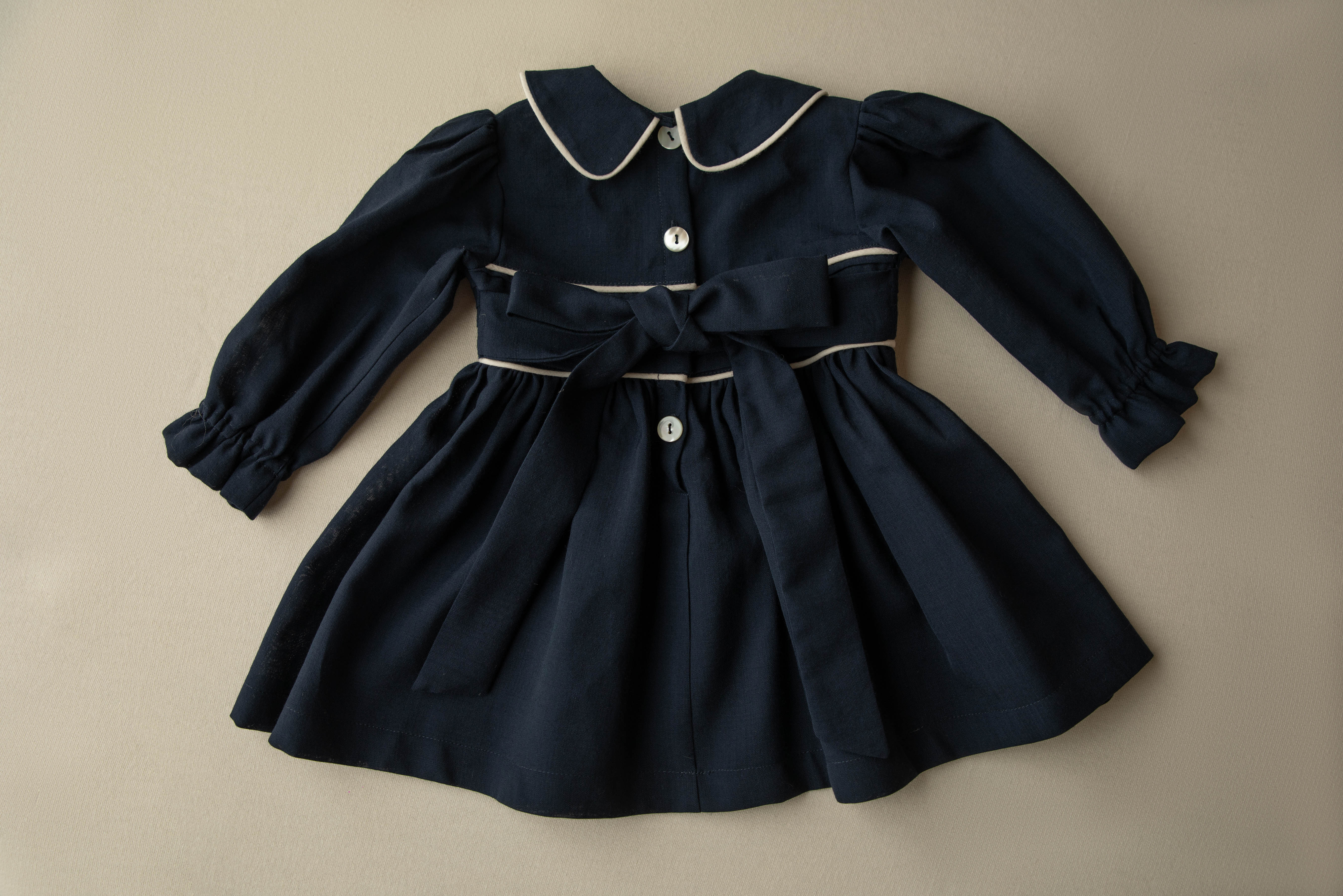 Il vestito si presenta con scollo a girocollo e colletto tondo, nella parte anteriore ha il