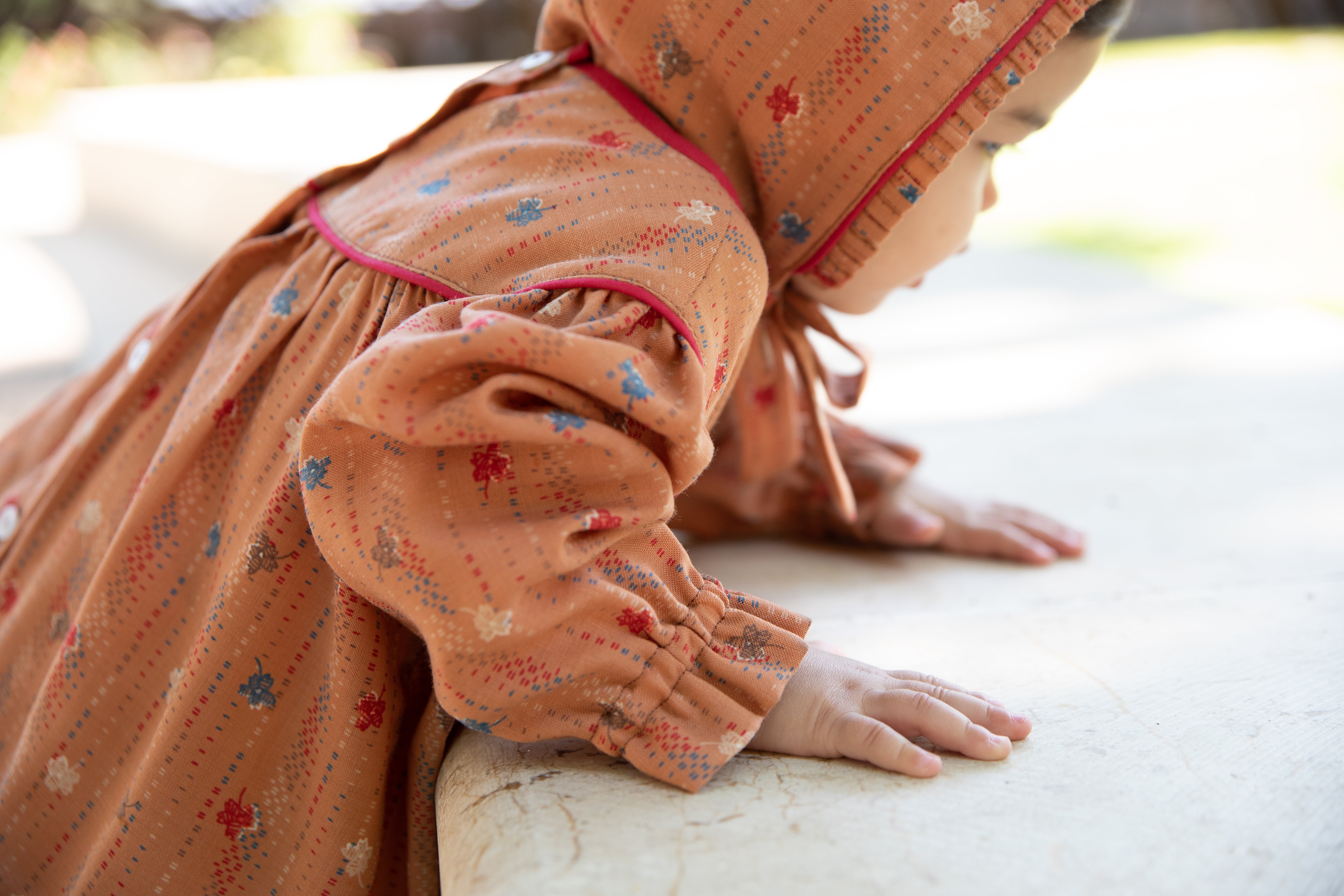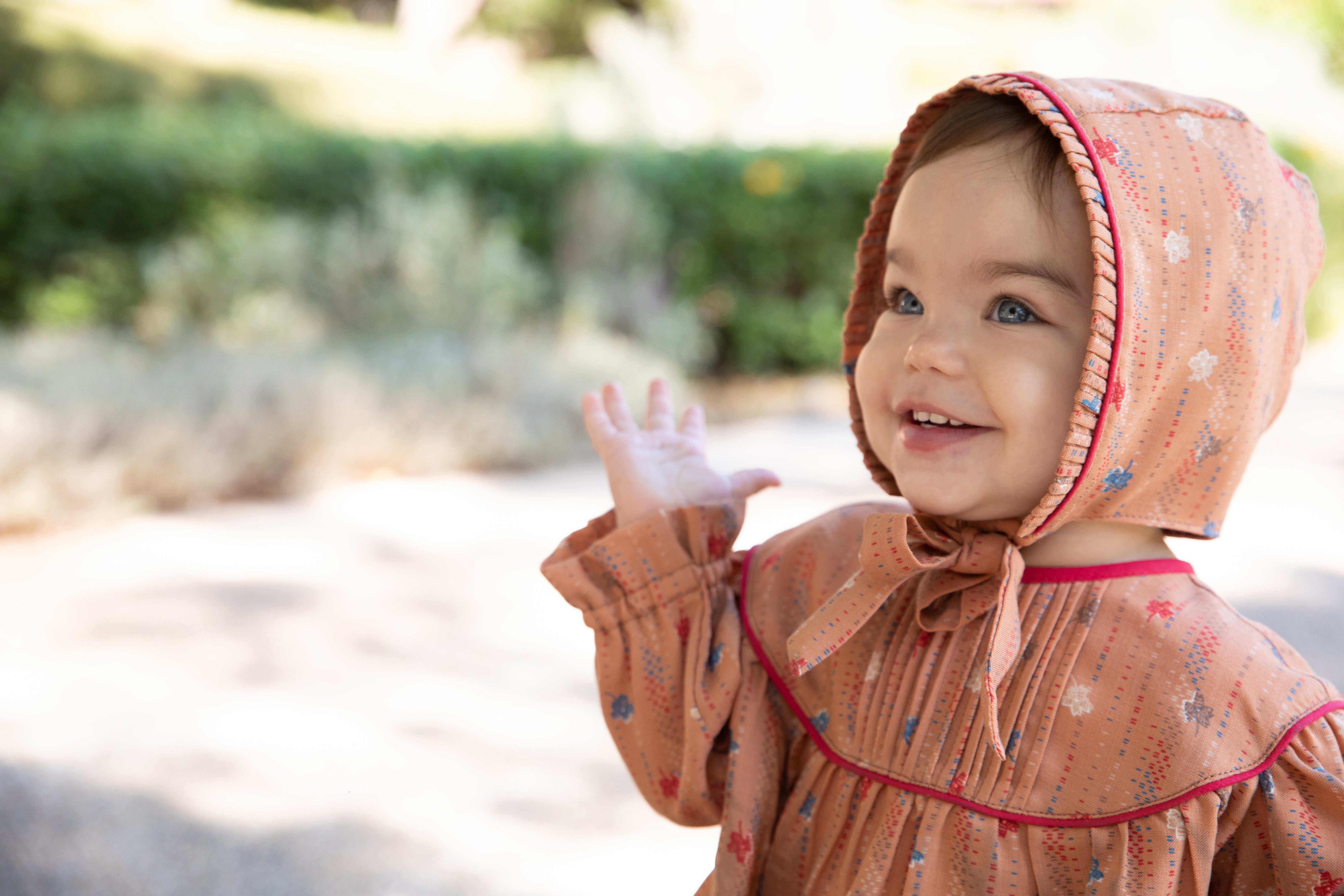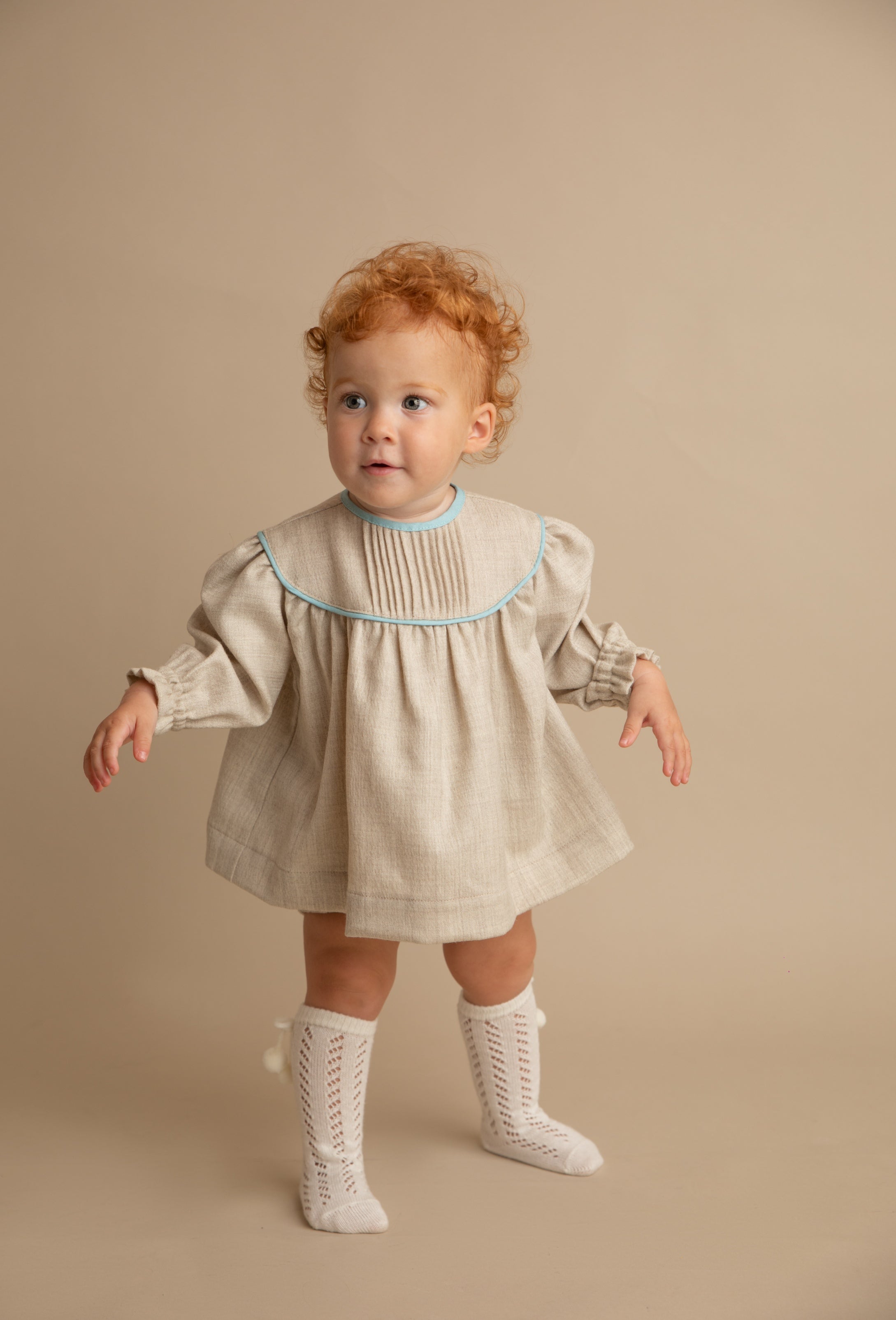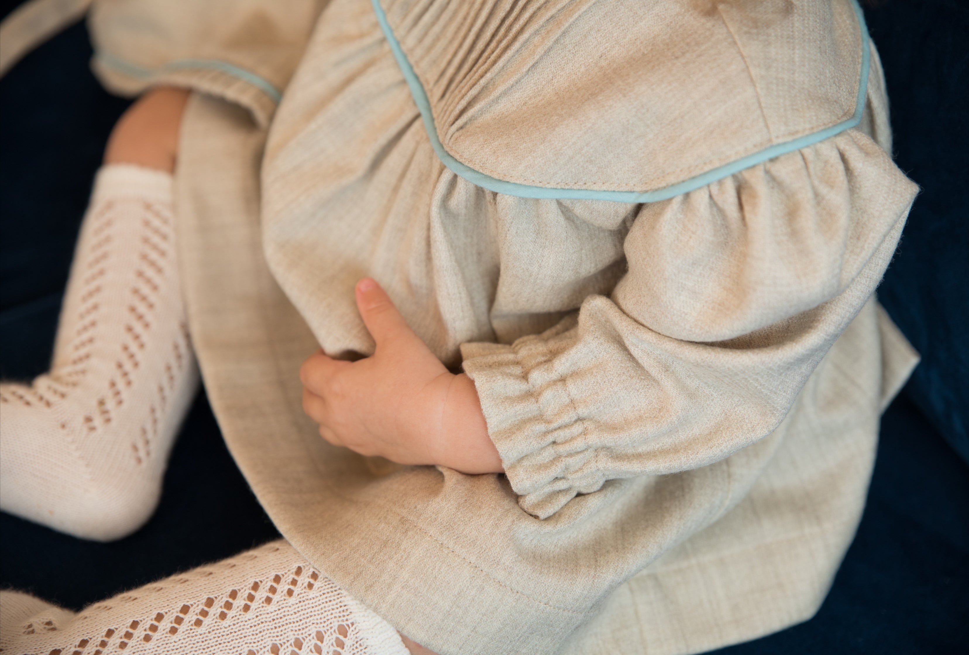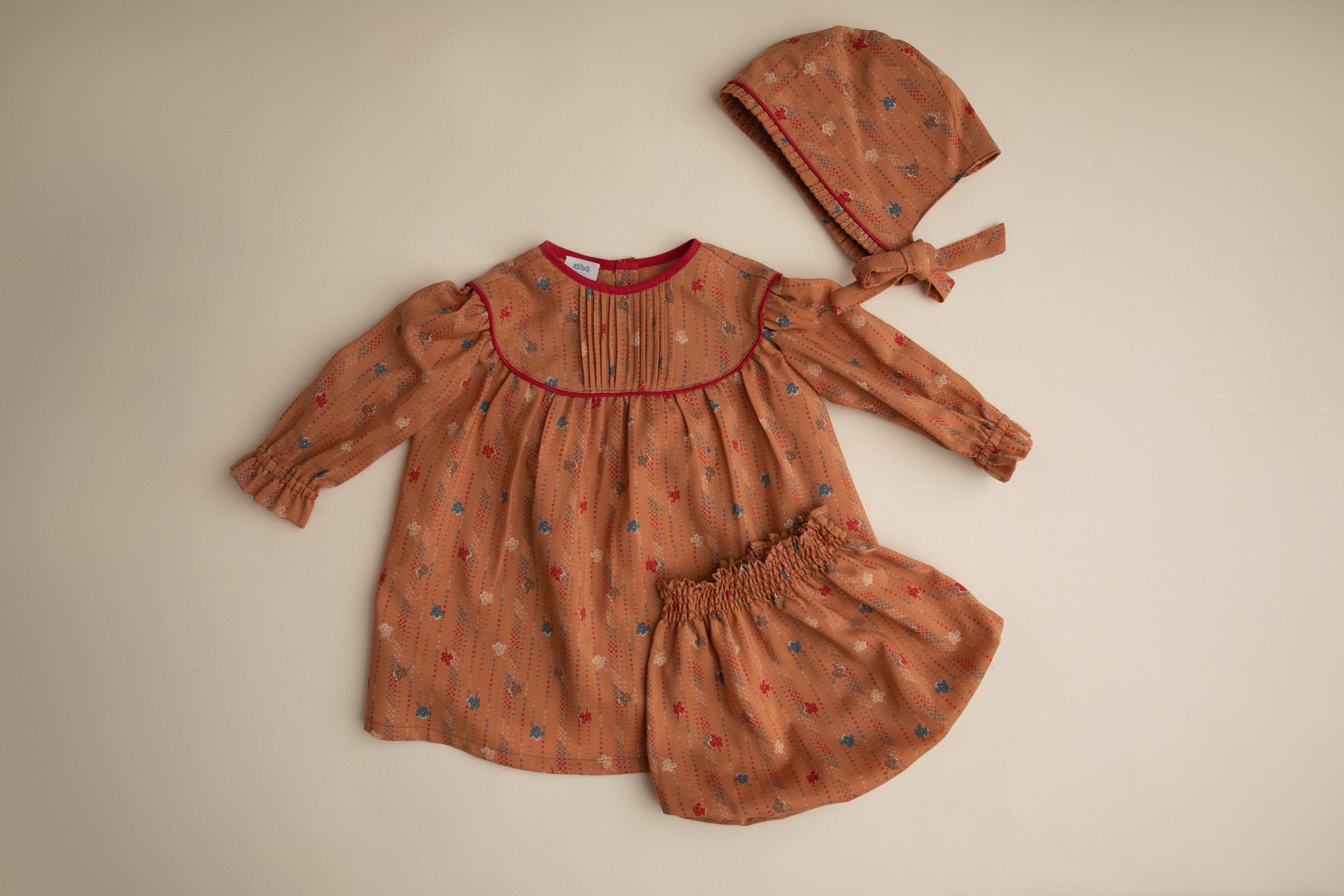 L'abitino Bucaneve si presenta a girocollo , nervature nella parte anteriore adagiate sopra il carrè. Manica lunga. Chiusura con bottoncini retro. Culotte con grinziture e pieghette. La cuffietta ton sur ton, presenta delle nervature nella parte frontale, chiusura con lembi per fiocco.