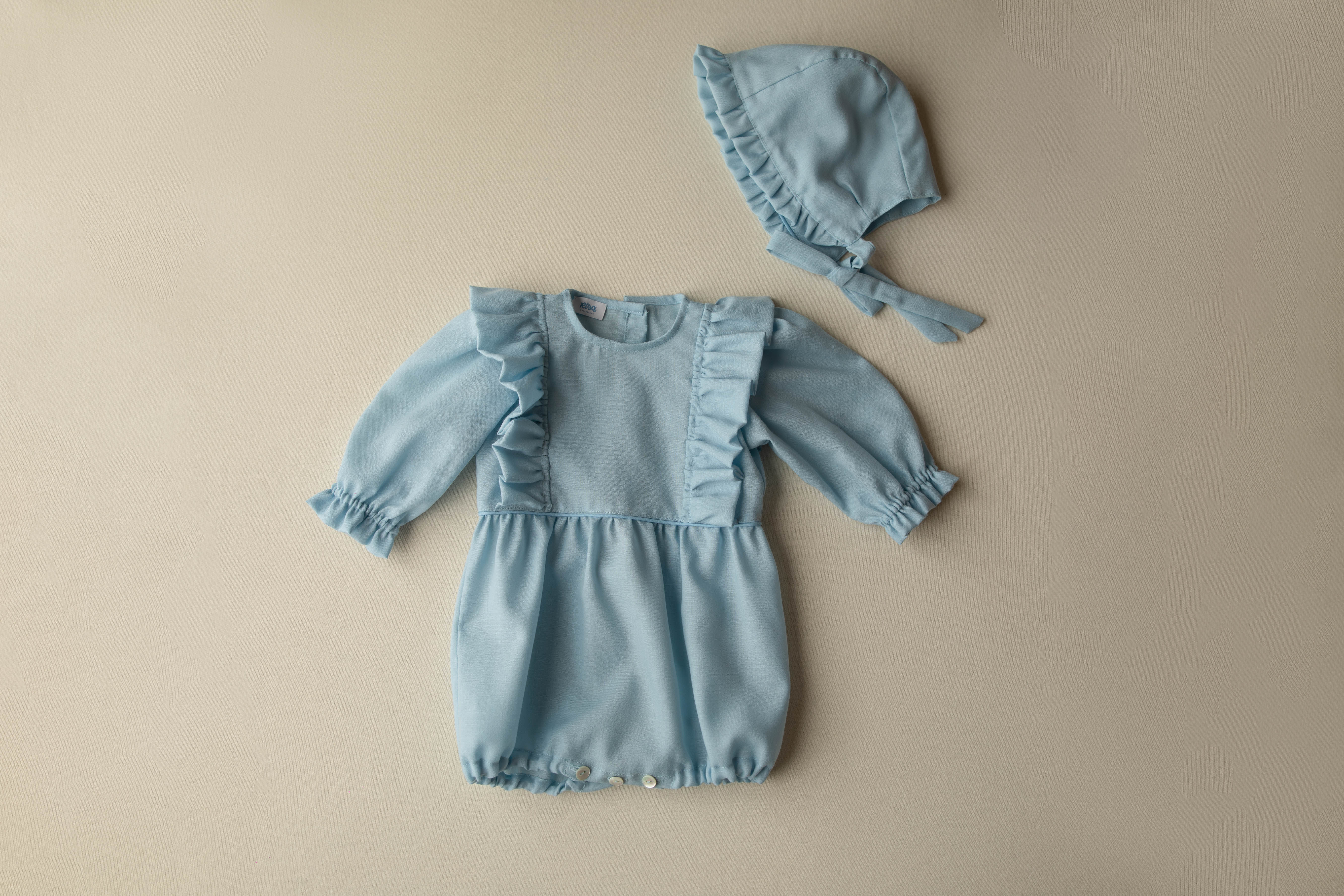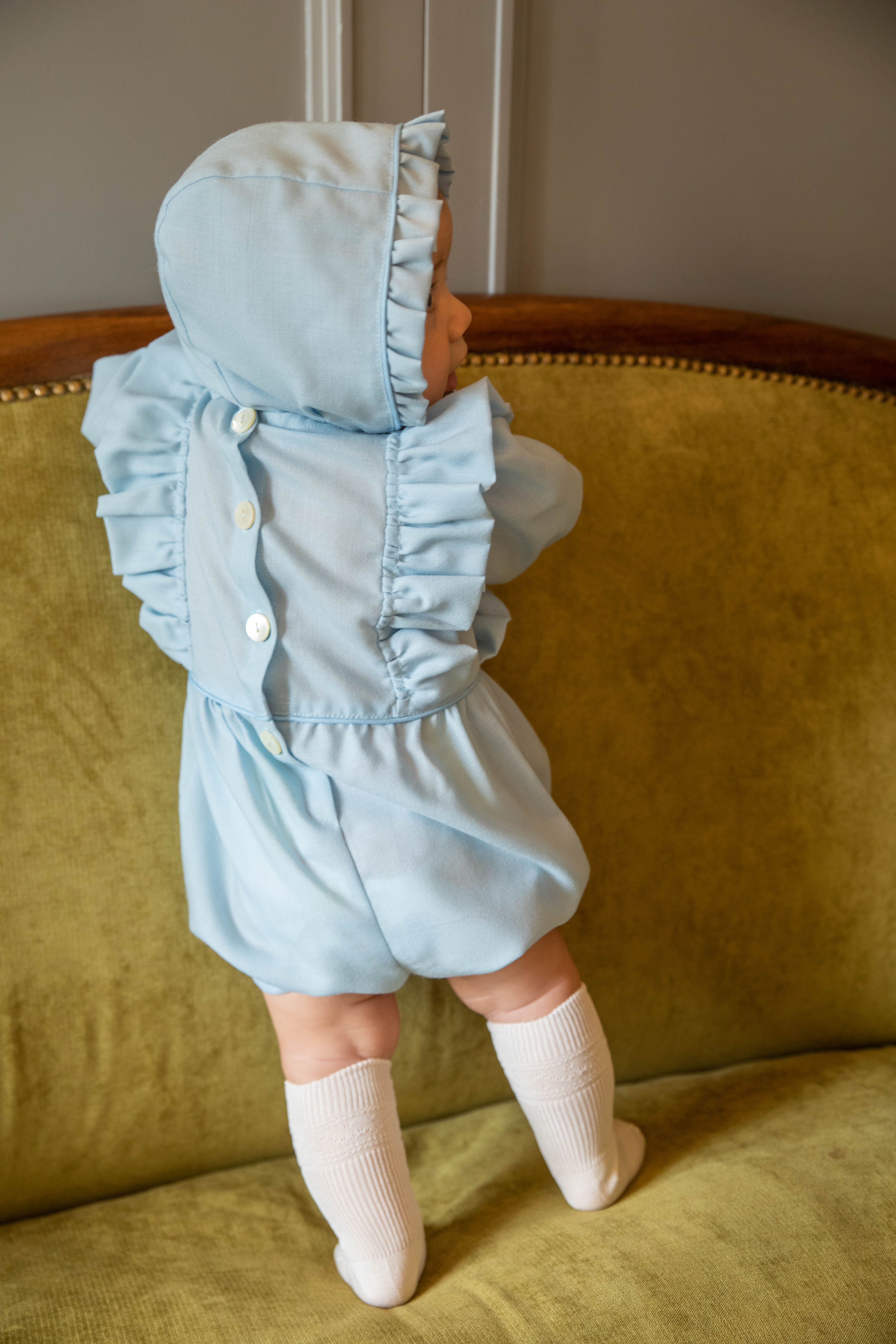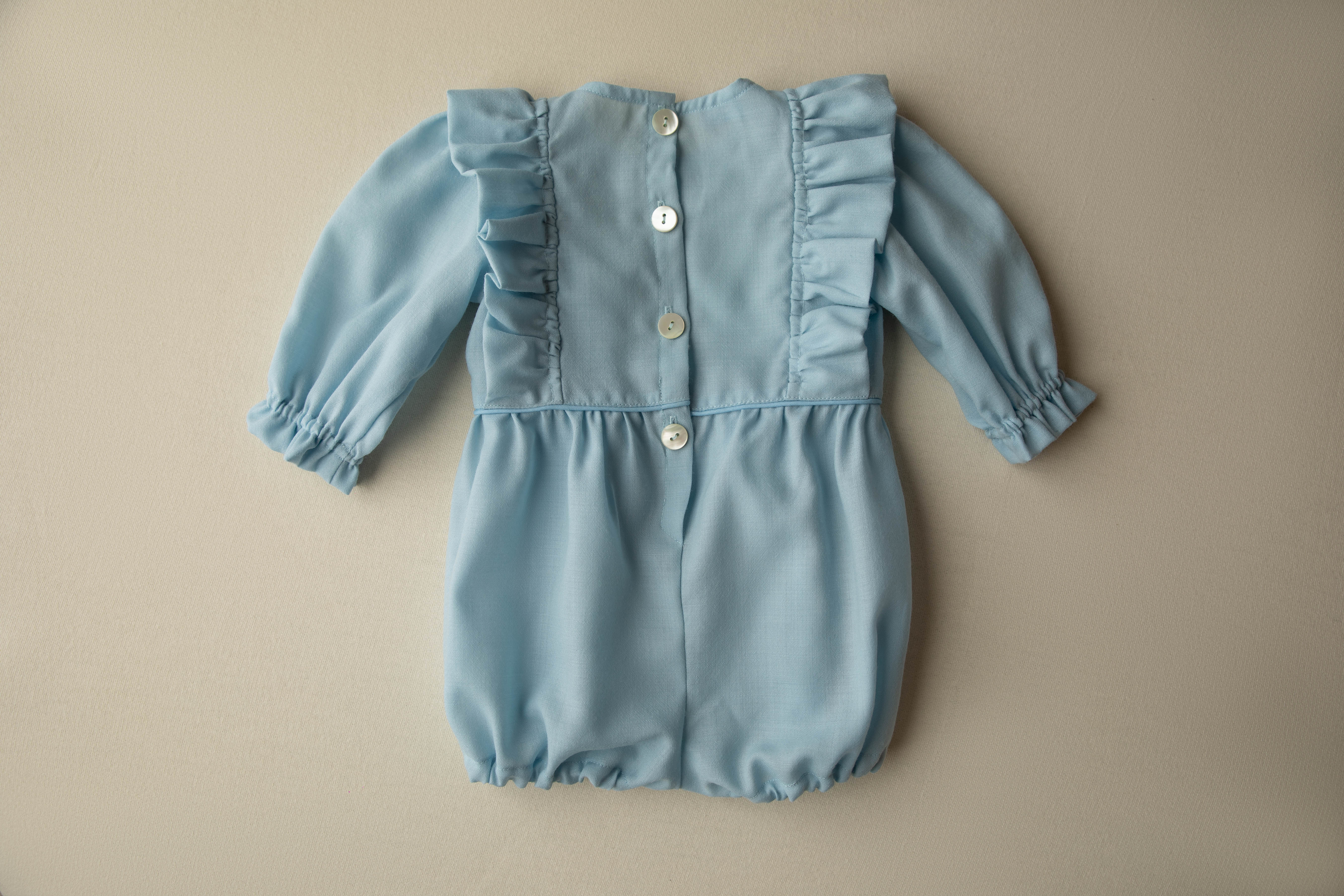 Il pagliaccetto si presenta a girocollo, ruches laterali nella parte centrale. Manica lunga sbuffata con volant. Carrè in vita e bottoncini nella parte inguinale. Chiusura dietro con bottoni. Cuffietta ton sur ton con ruches nella parte frontale. Chiusura con laccetti.