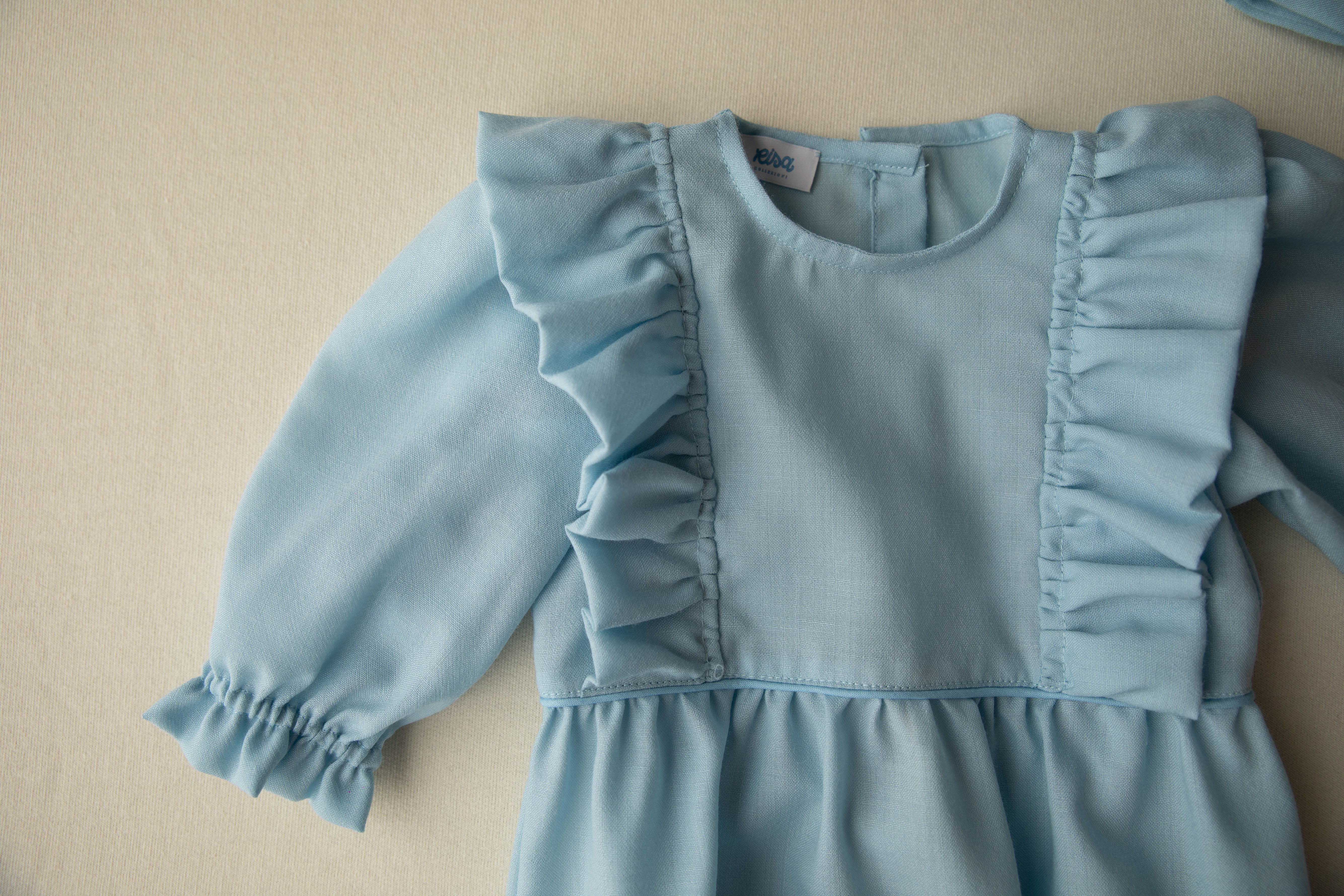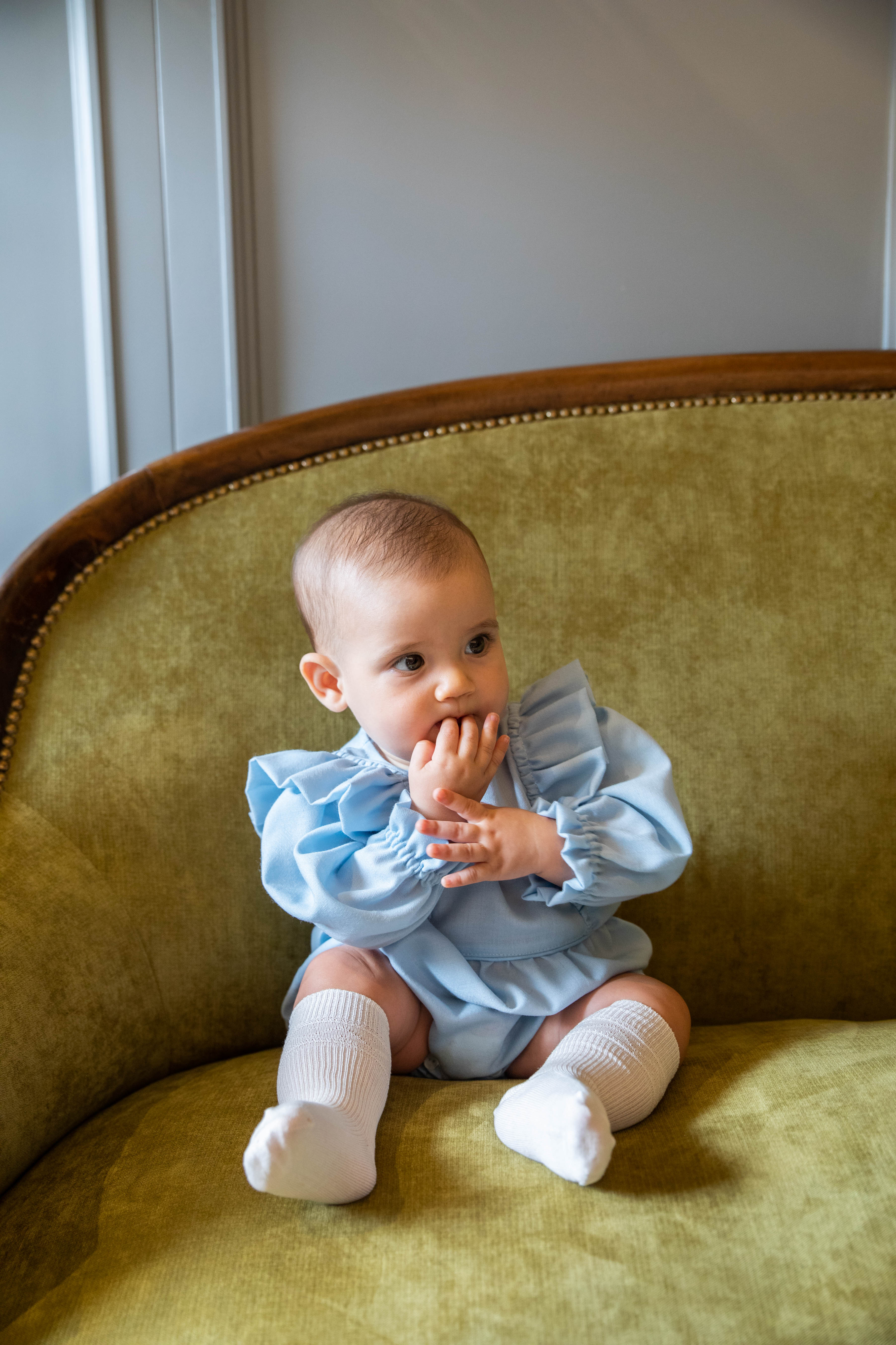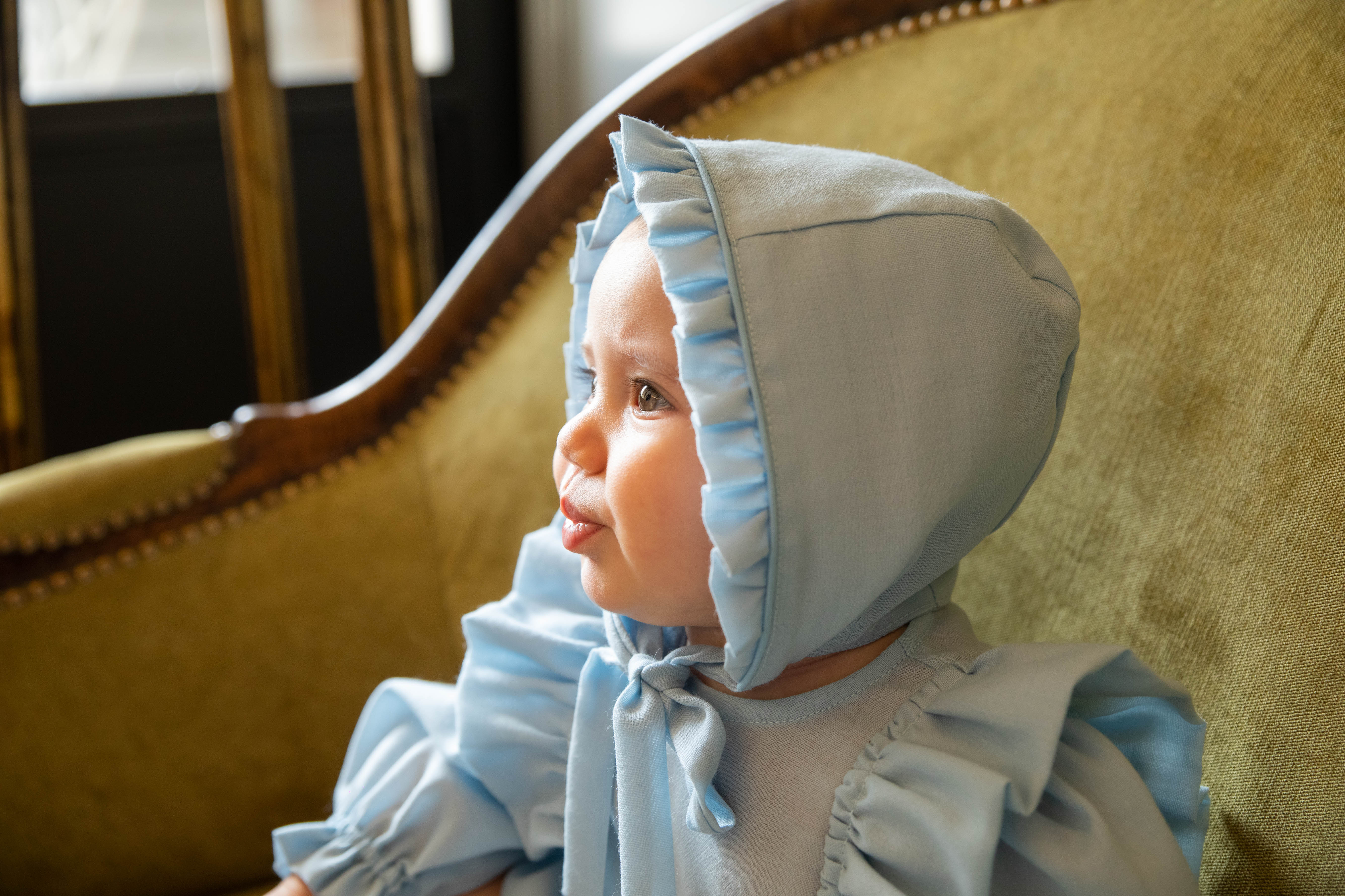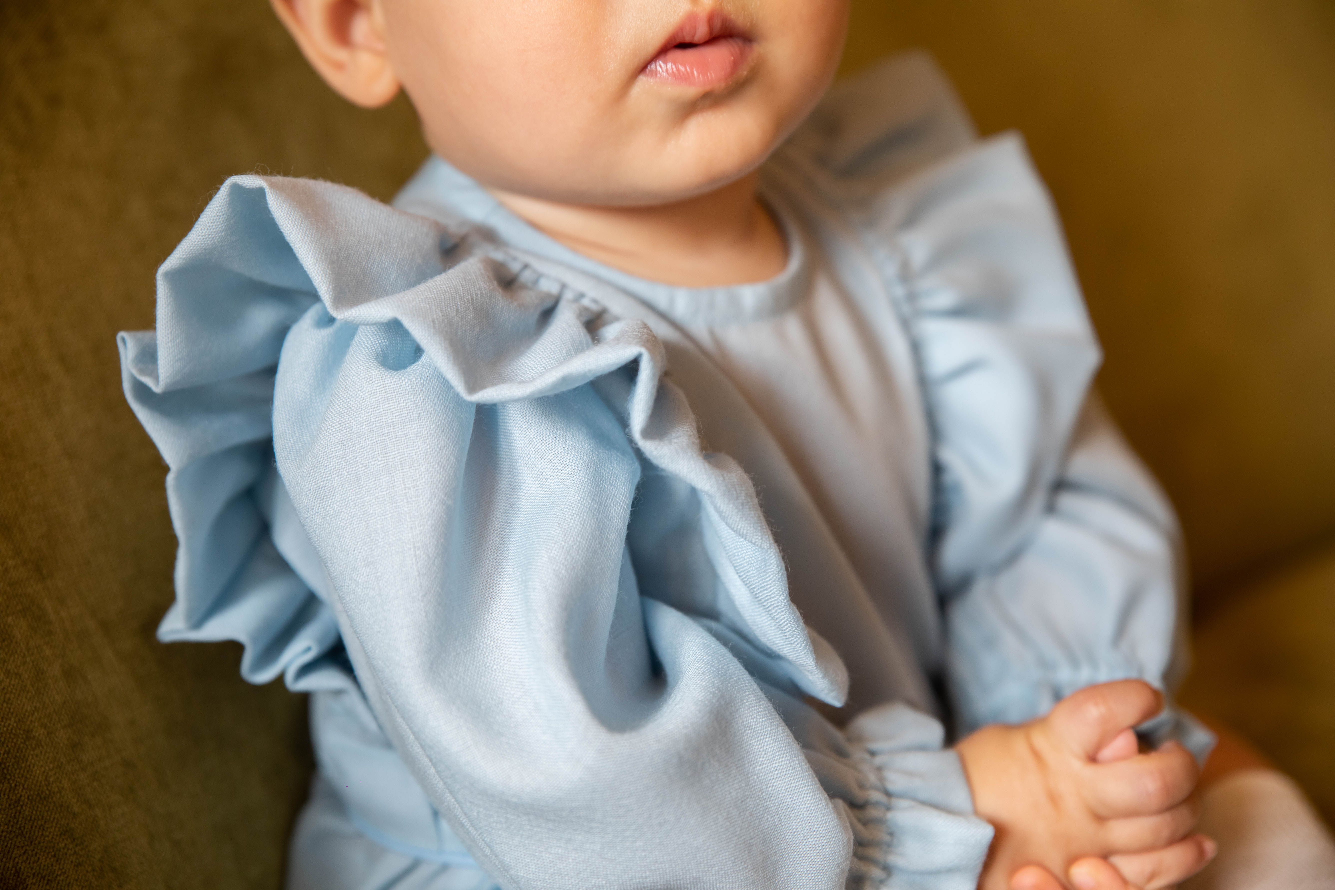 Il pagliaccetto si presenta a girocollo, ruches laterali nella parte centrale. Manica lunga sbuffata con volant. Carrè in vita e bottoncini nella parte inguinale. Chiusura dietro con bottoni. Cuffietta ton sur ton con ruches nella parte frontale. Chiusura con laccetti.