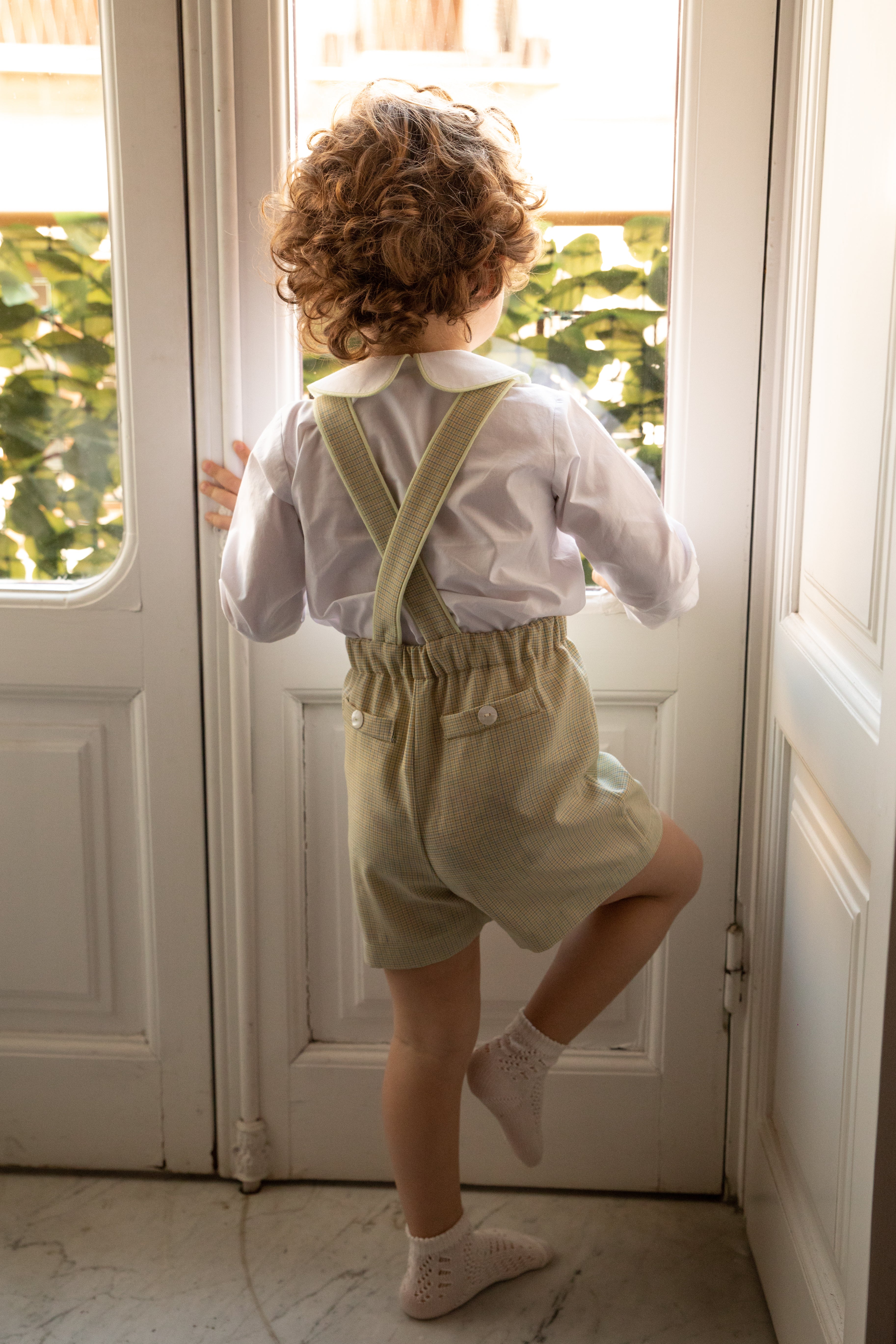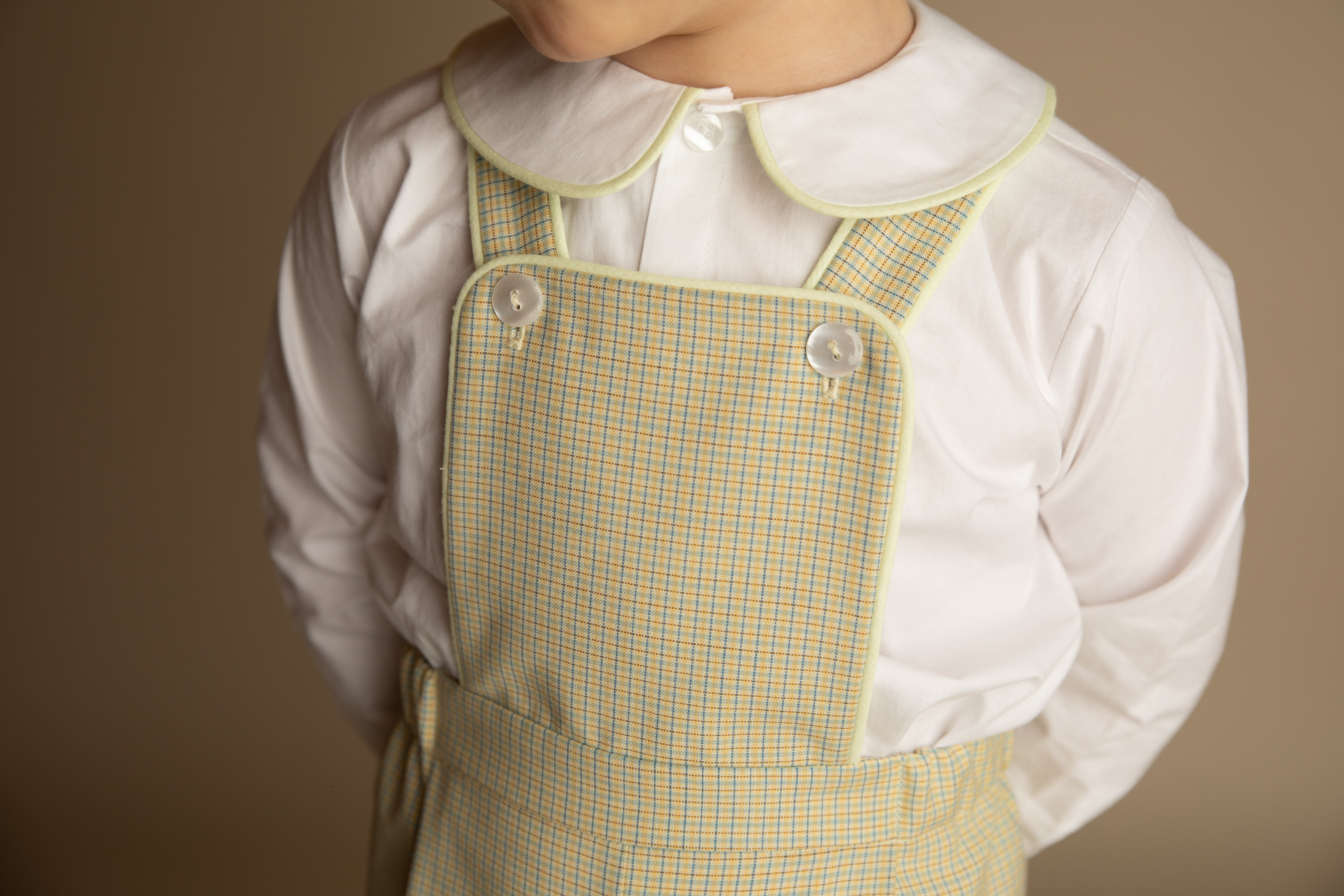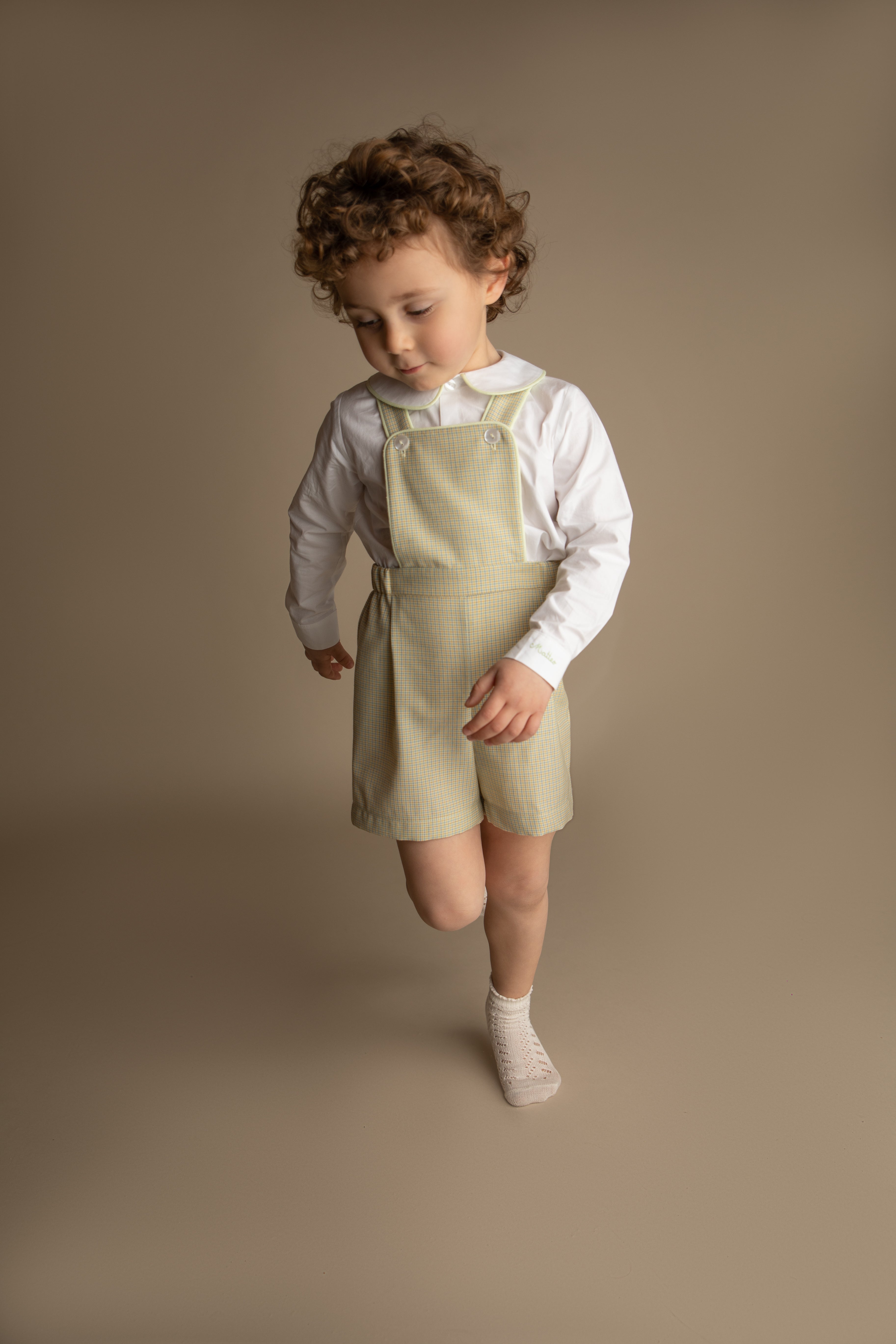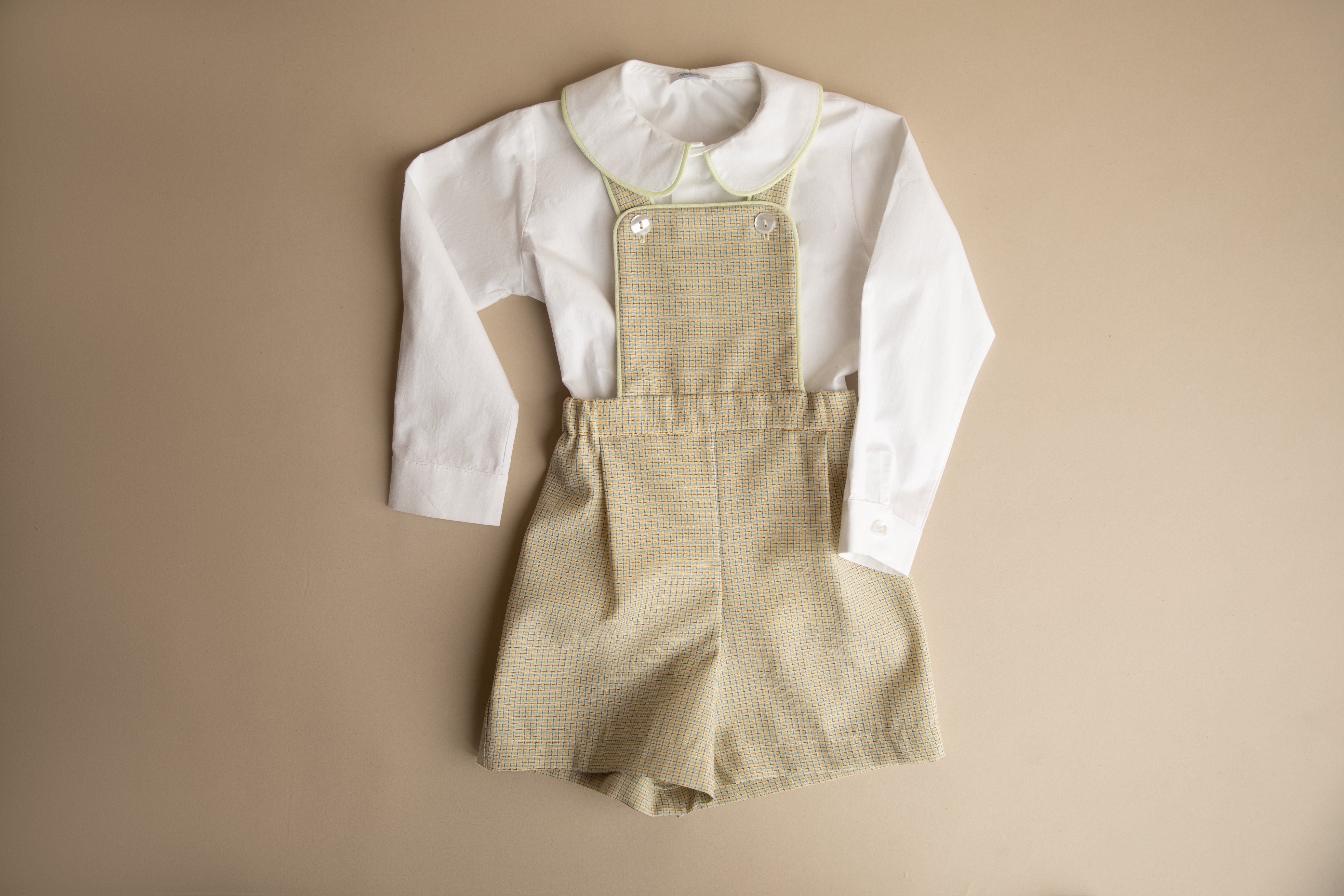 La salopette si presenta con pettorina in avanti e bottoncini. Parte posteriore con bretelle a incrocio. Il pantaloncino ha la vita alta, elastico all' interno per regolare la misura. Nella parte posteriore tasche a filetto.