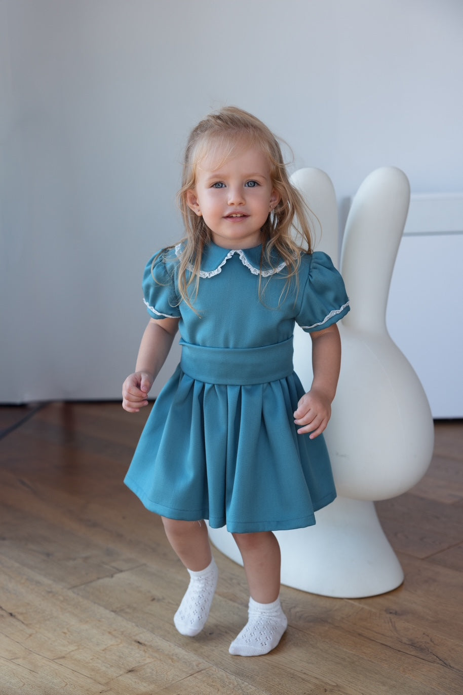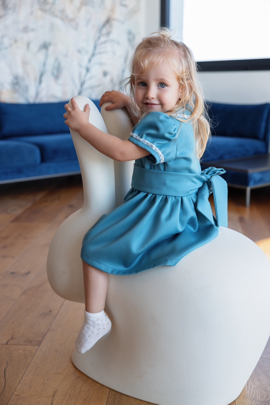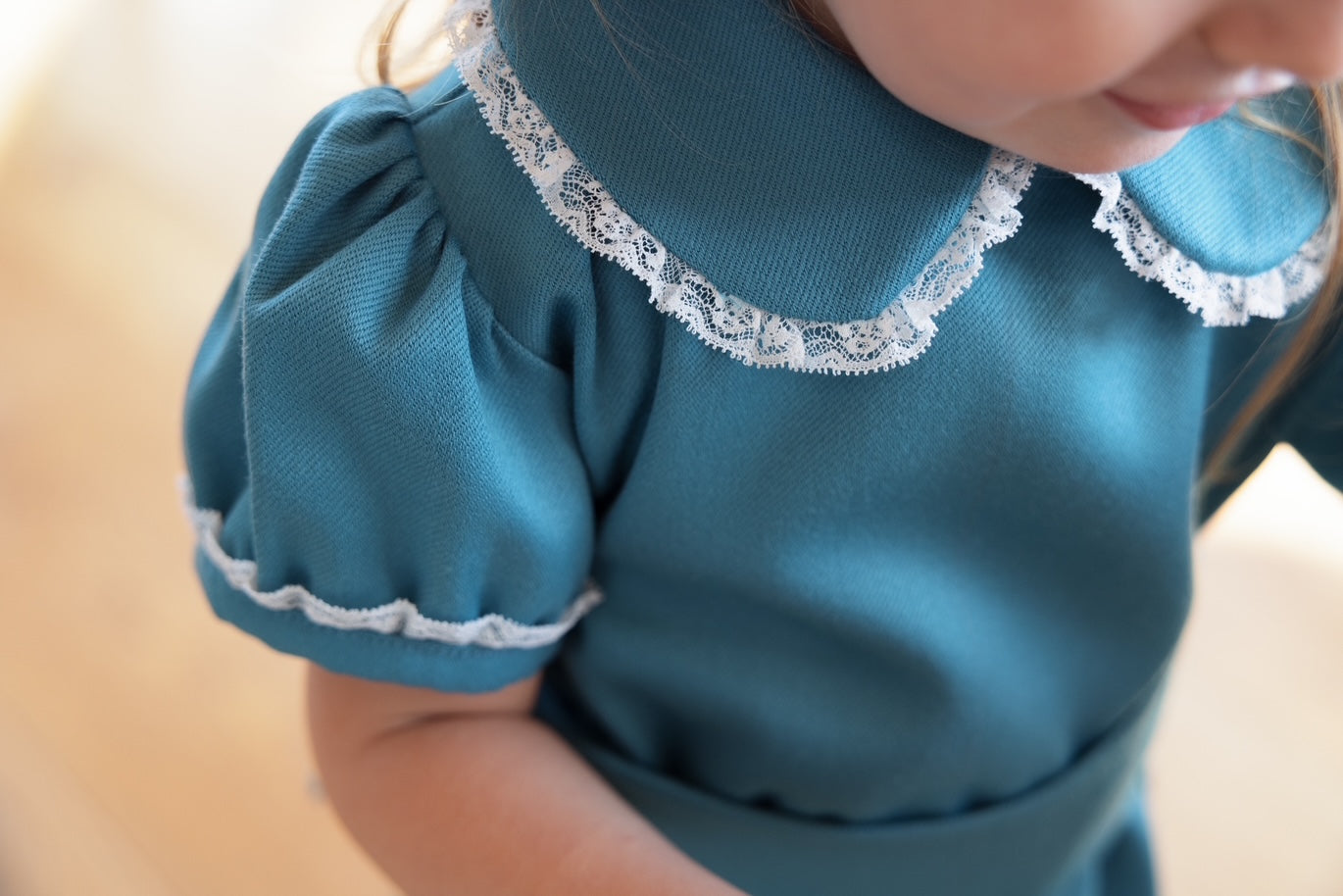 L'abito lucy si presenta con colletto tondo, e profilo in pizzo valencienne sia nel colletto che nella manicchina corta. Fascia anteriore che chiude nella parte posteriore con lembi per fiocco. Bottoncini parte posteriore in madre perla.
