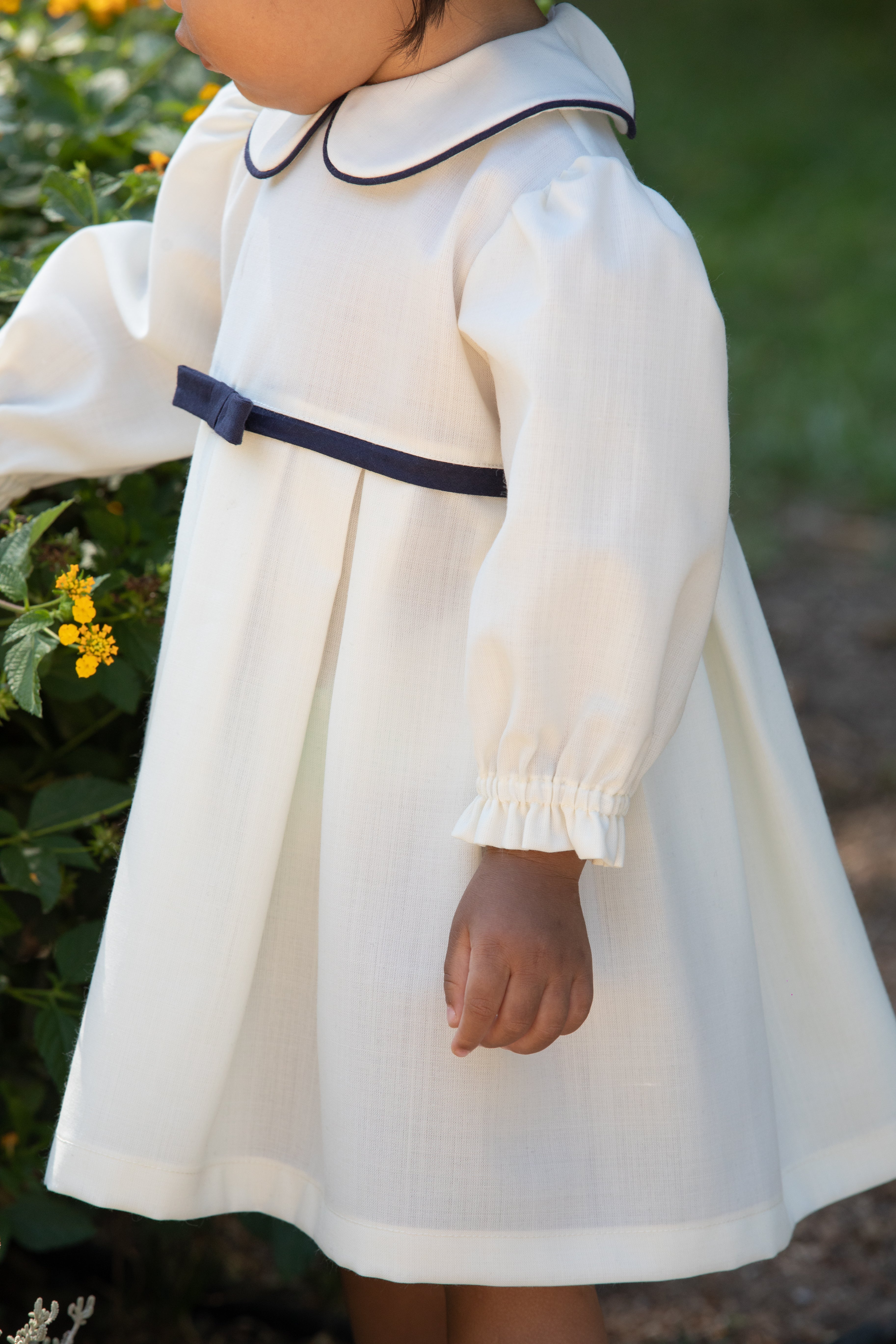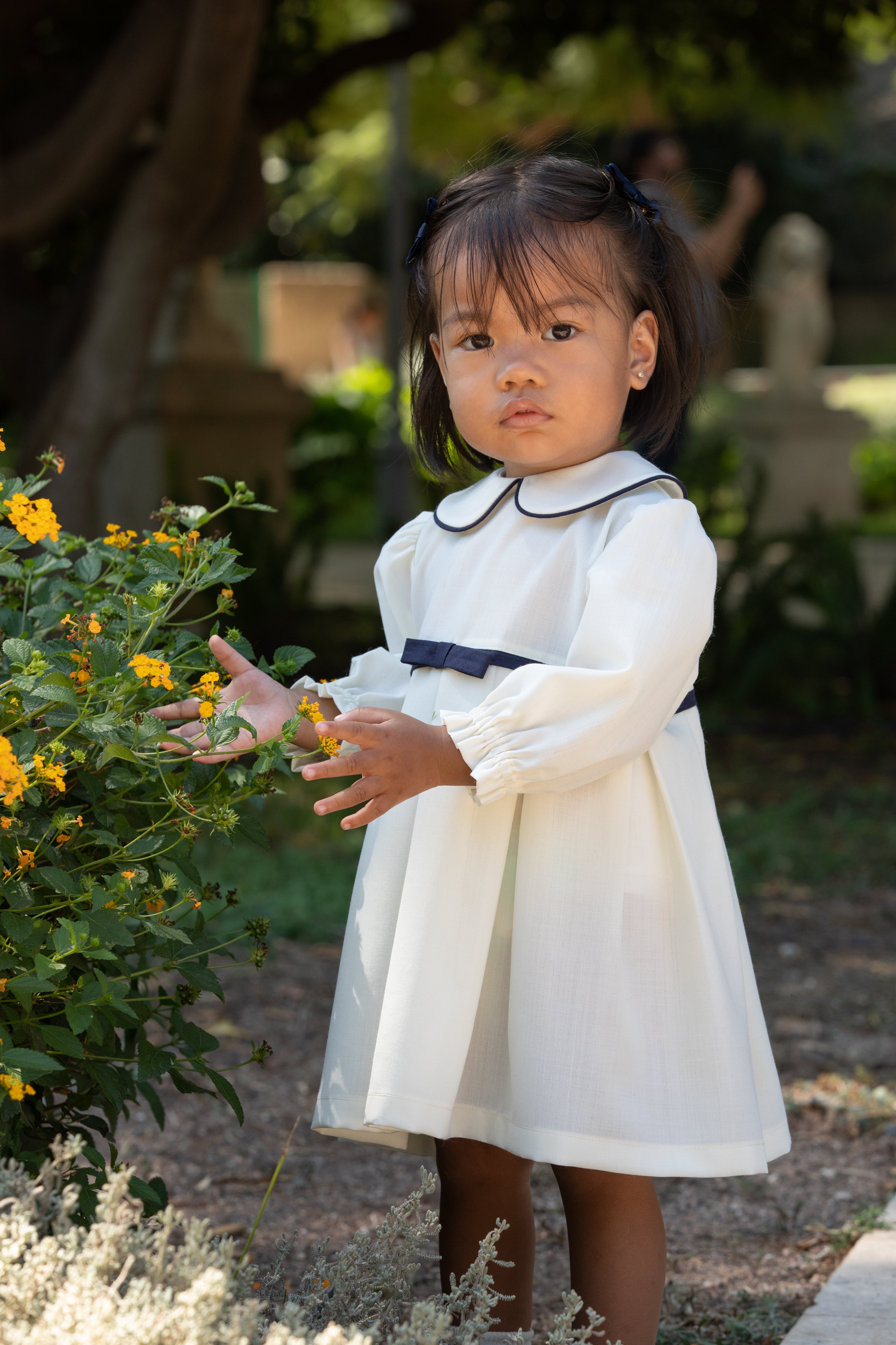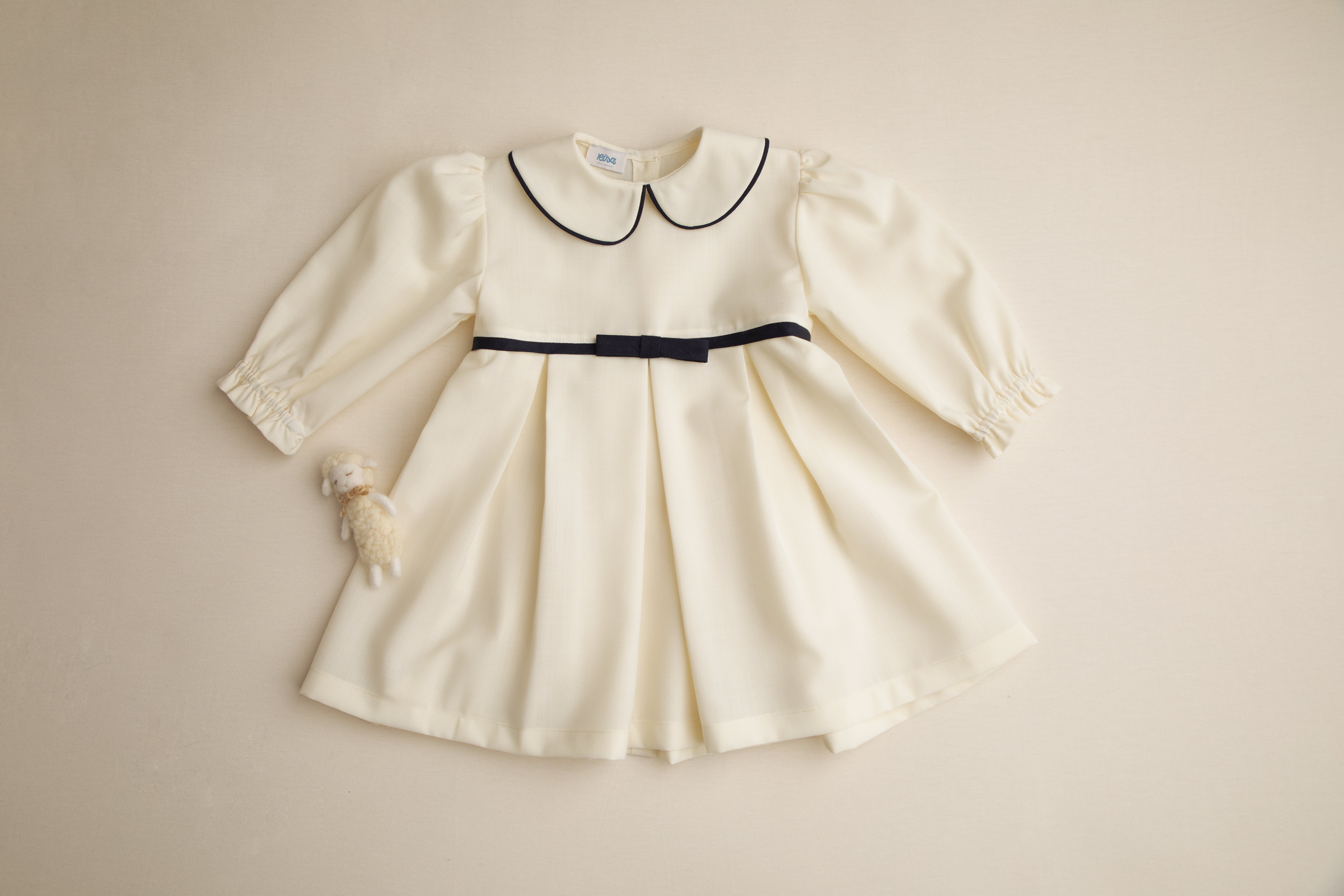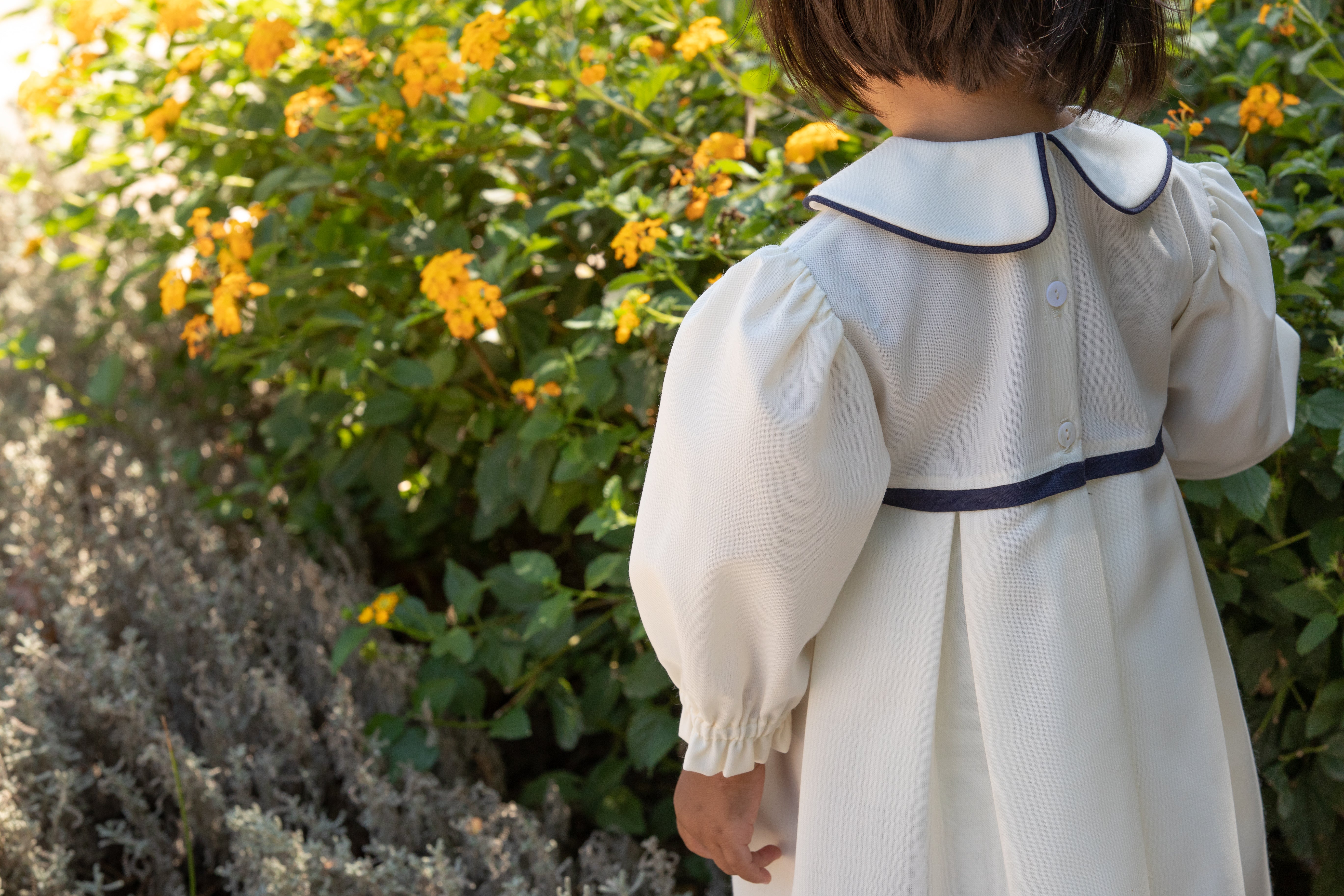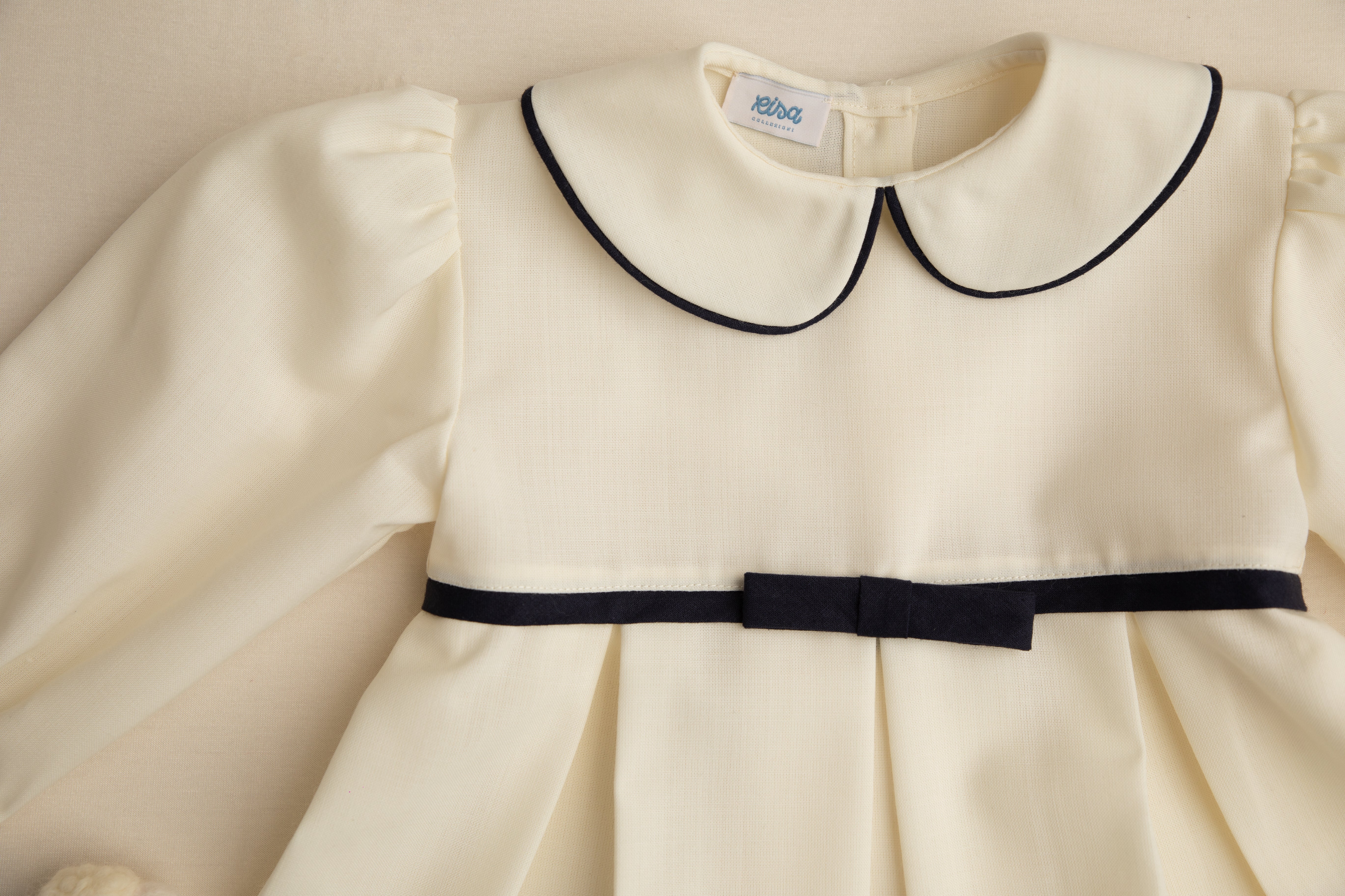 Presenta il Colletto tondo con profilo. Carrè nella parte anteriore con profilo e fiocchetto. Piegoni a cannone sia nella parte anteriore che posteriore. Chiusura con bottoni dietro madre perla.