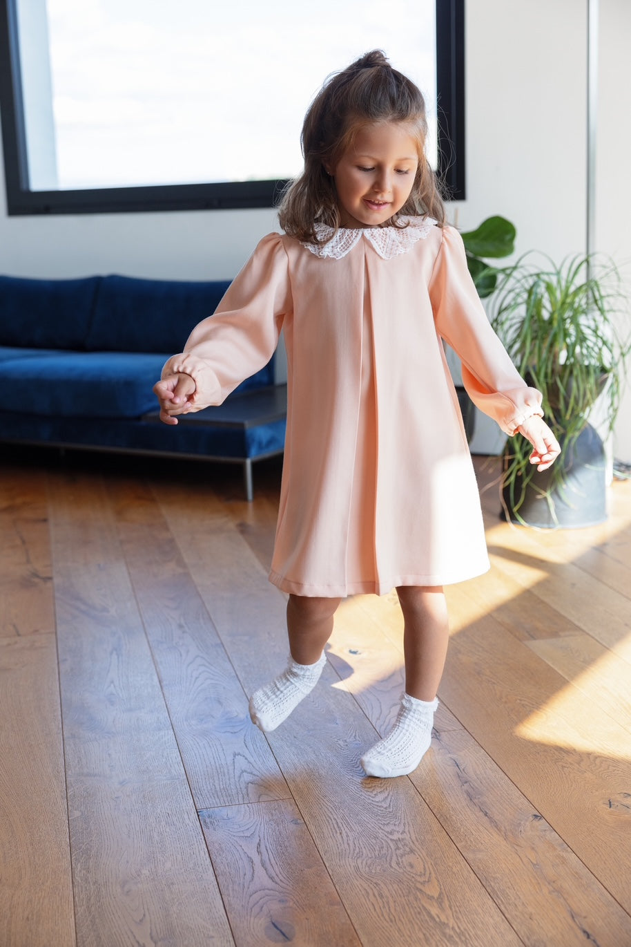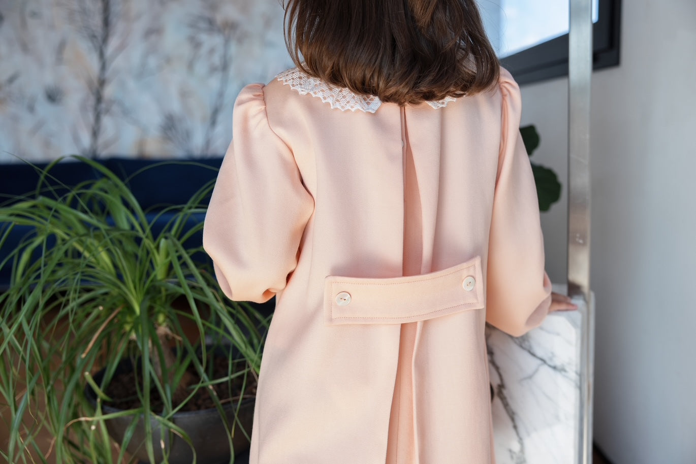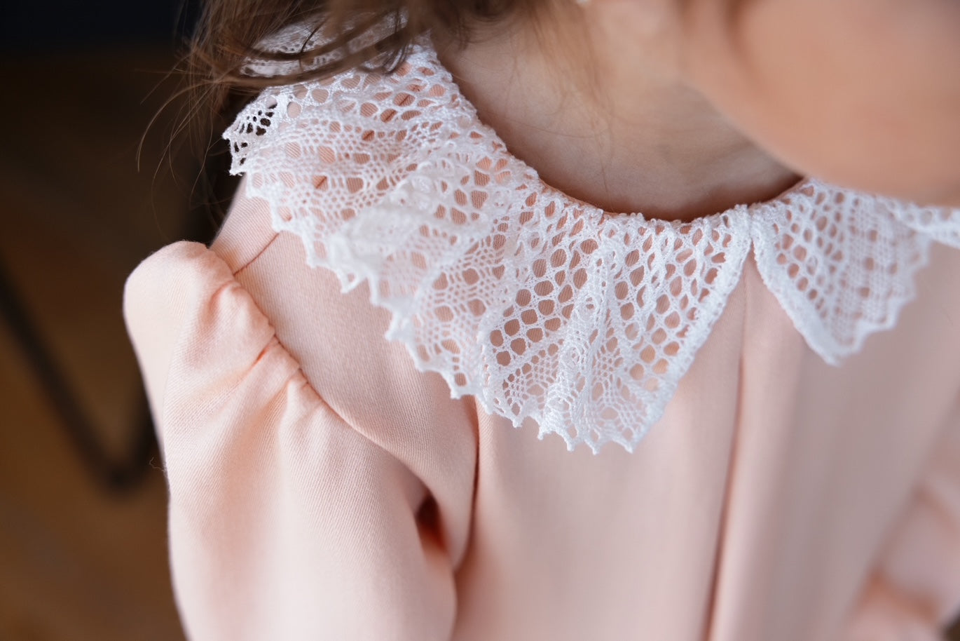 L' abitino Perla ha il colletto in pizzo di cotone , nella parte anteriore la pierga a cannone cosi come la parte posteriore, che chiude con bottoni madre perla e martingala.