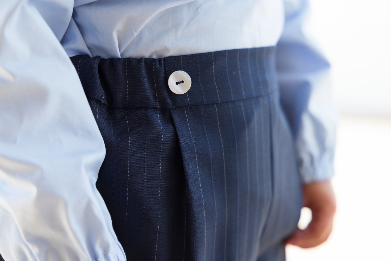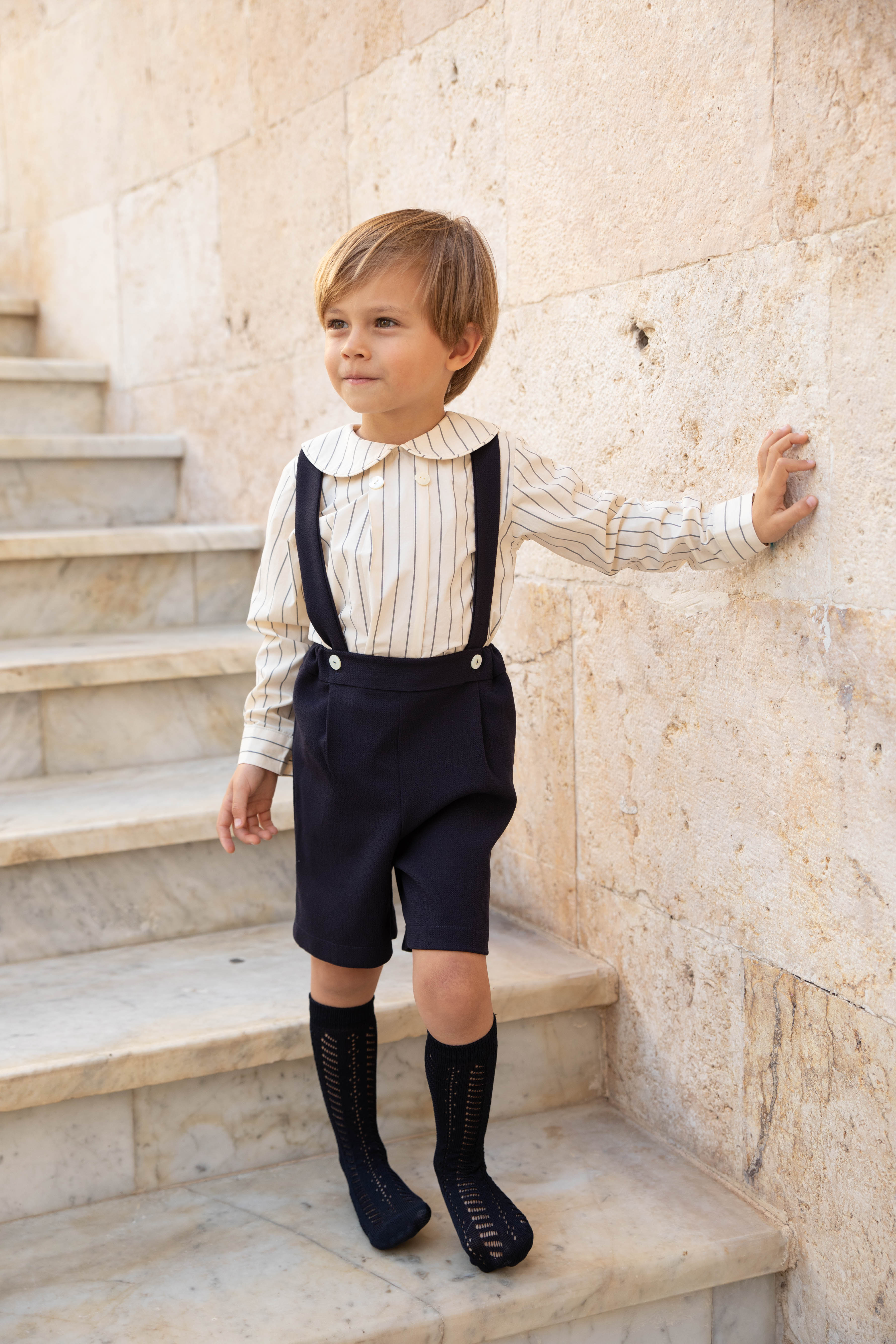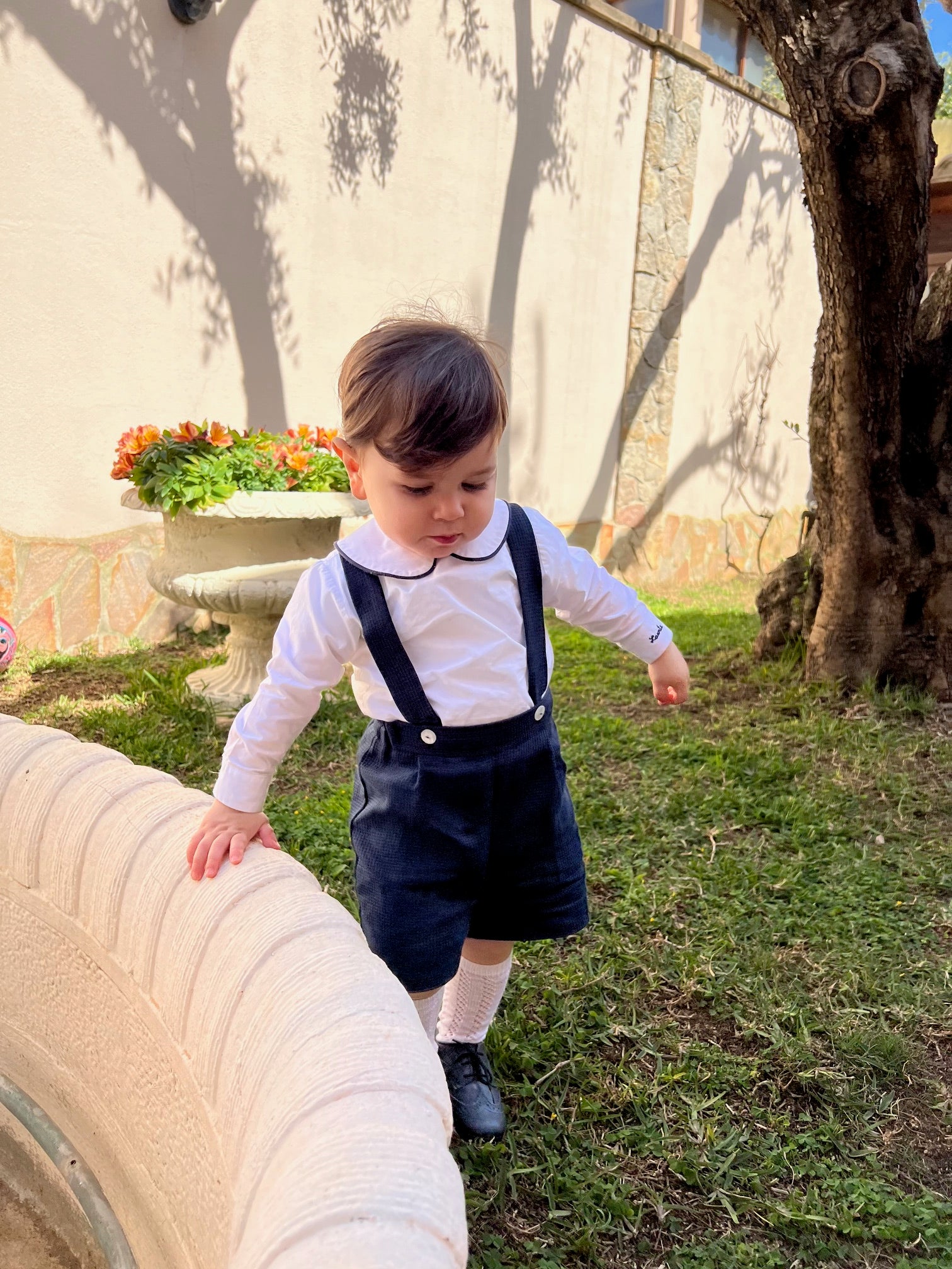 Il bermuda con bretelle si presenta con vita alta, pinces e bottoni nella parte anteriore . All'interno elastico per regolare la misura. Lunghezza del bermuda al ginocchio.