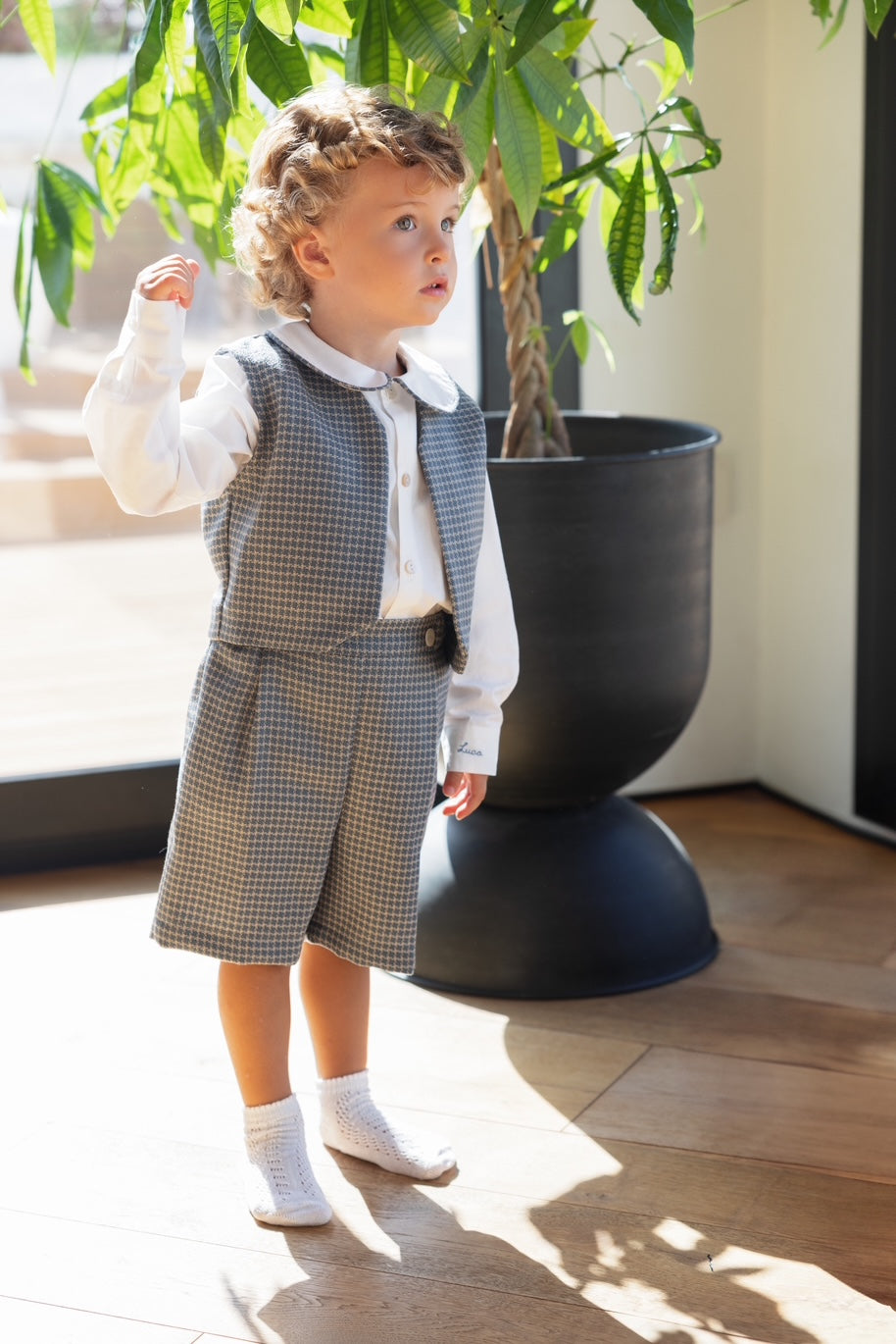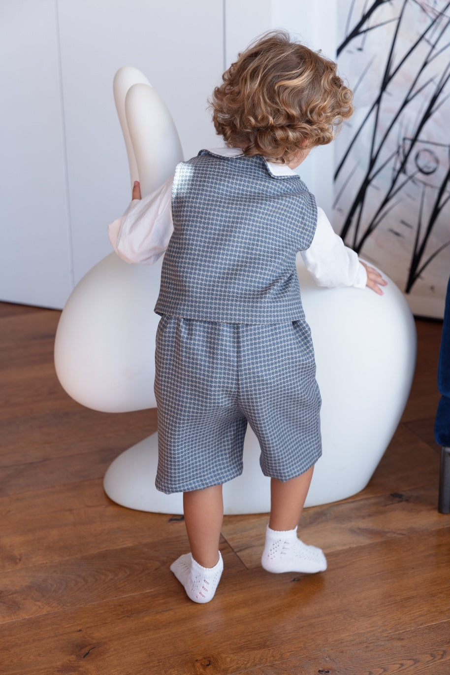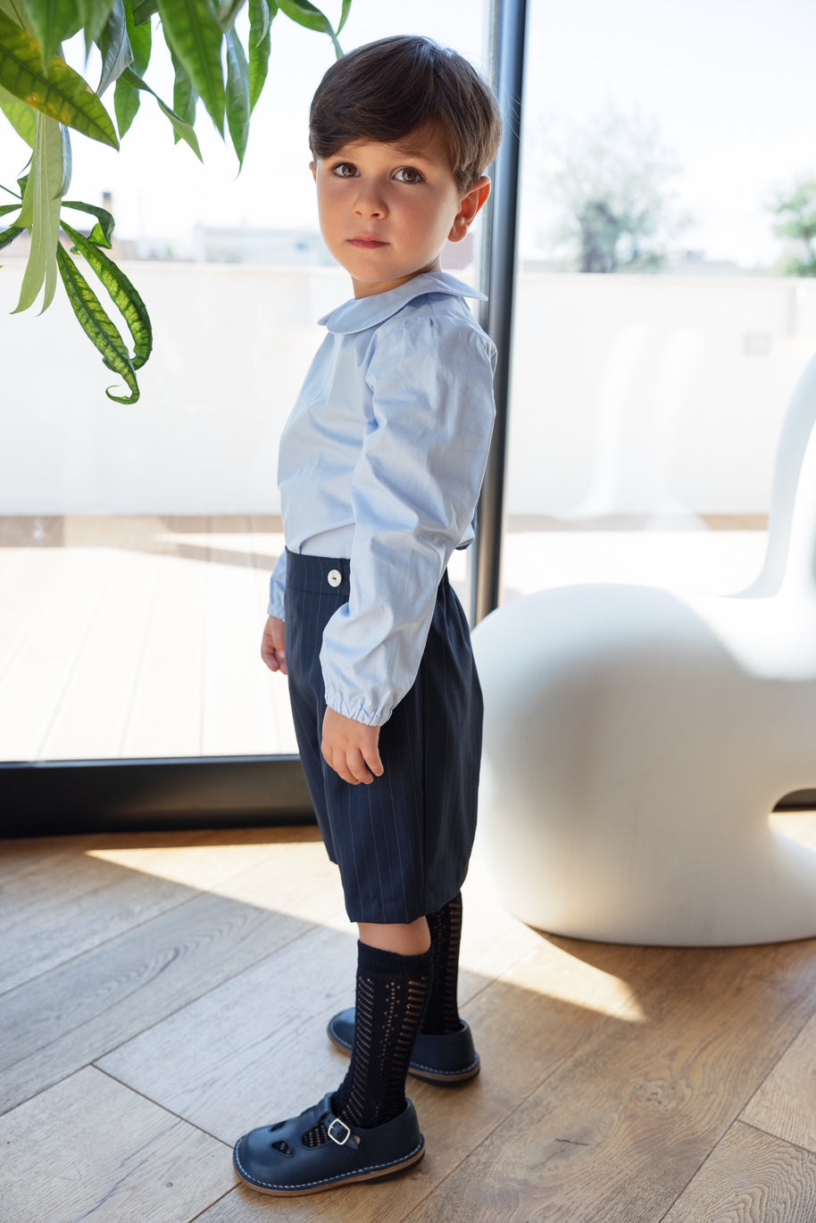 Il bermuda con bretelle si presenta con vita alta, pinces e bottoni nella parte anteriore . All'interno elastico per regolare la misura. Lunghezza del bermuda al ginocchio.